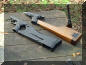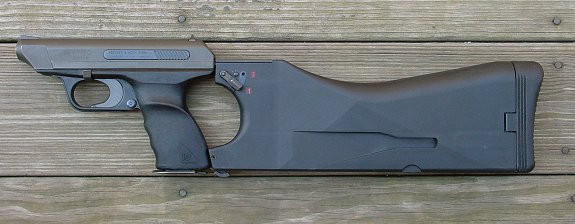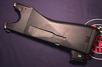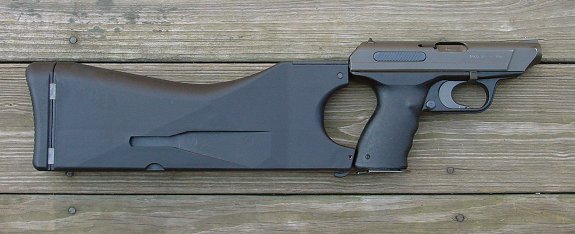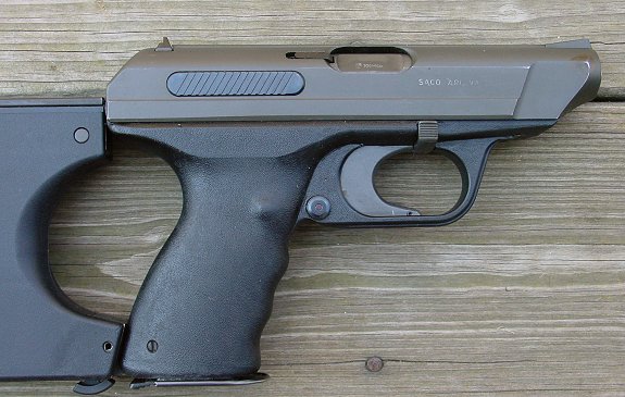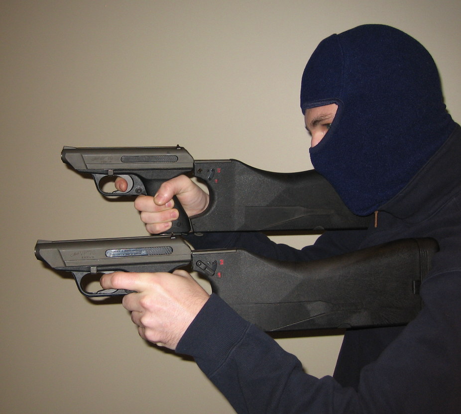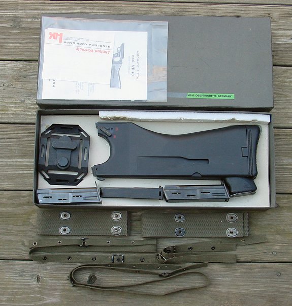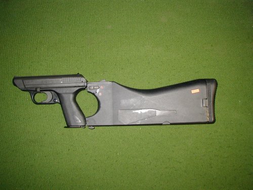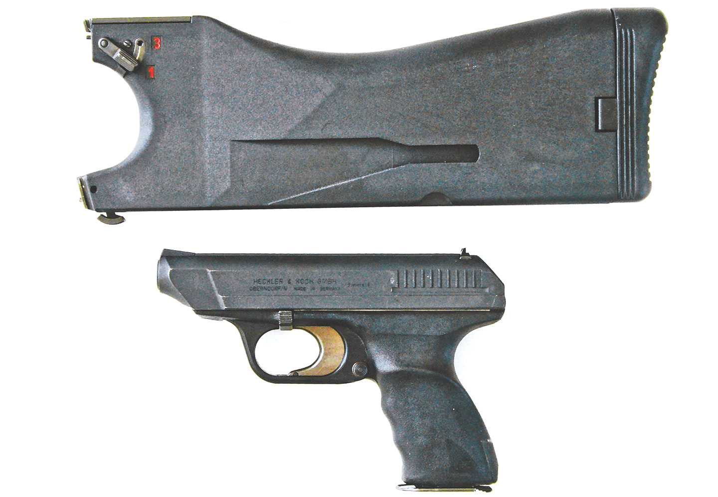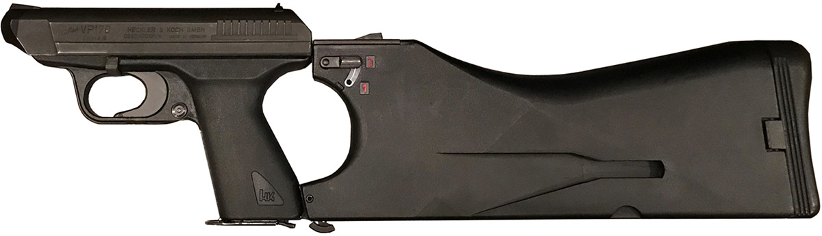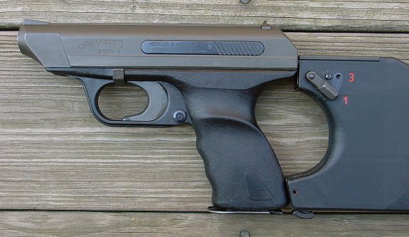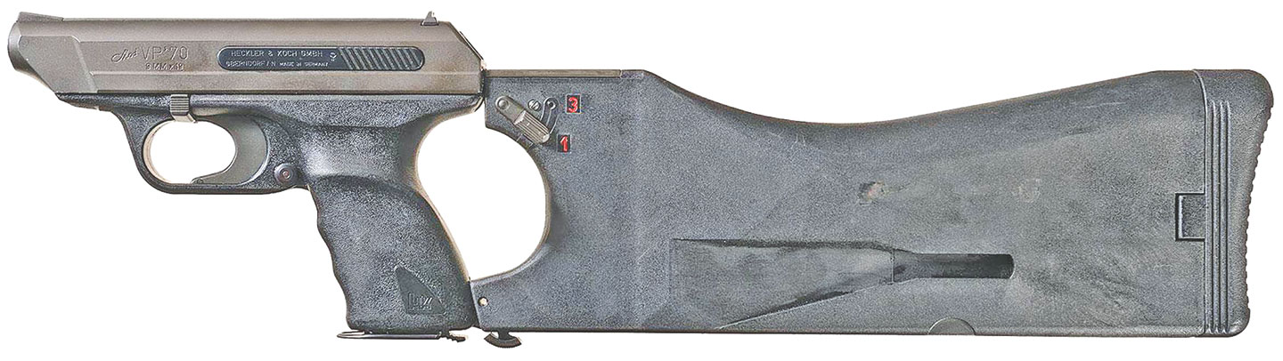 VP70的枪托也是硬式枪套,这种一物二用的方式即所谓的“盒子炮”正如全自动毛瑟手枪和俄罗斯的斯捷奇金手枪。枪套上有专用挂具,可挂于腰带上或挟在腋下。但这种又大又硬又重的枪套并不好用的。枪托的另一个主要作用就是提供点射功能,也应是说,如果不装上枪托,VP70只能单发射击。快慢机装在枪托的左前端,安装枪套时,须将快慢机柄装定于“1”。向后压枪套底部的连接卡笋,将枪套插入手枪后端的连接槽中,向上推直至与卡笋扣合为止。
