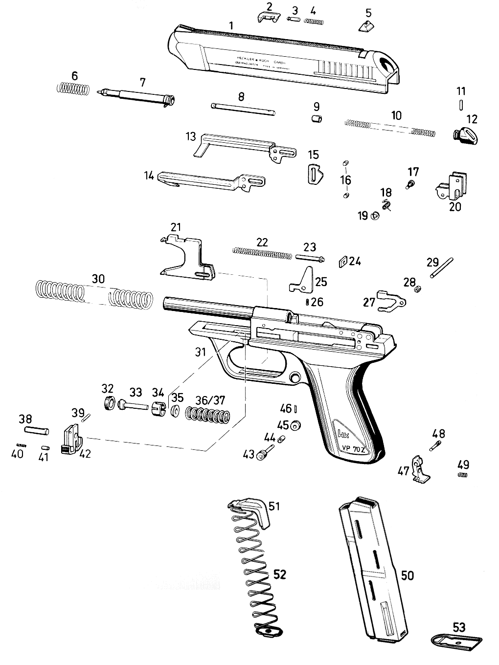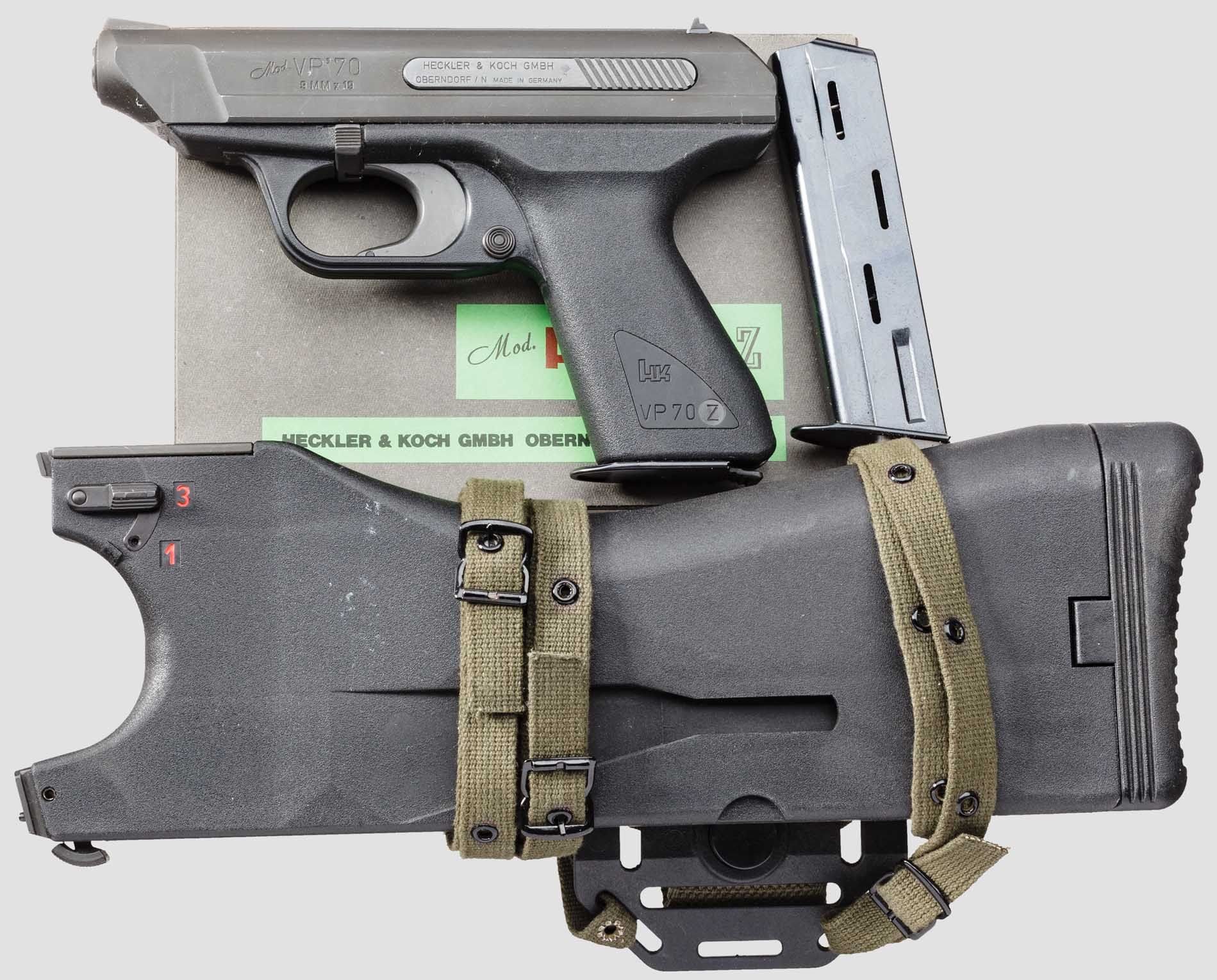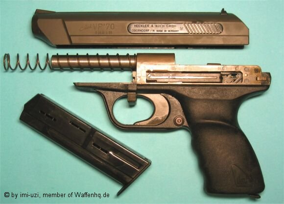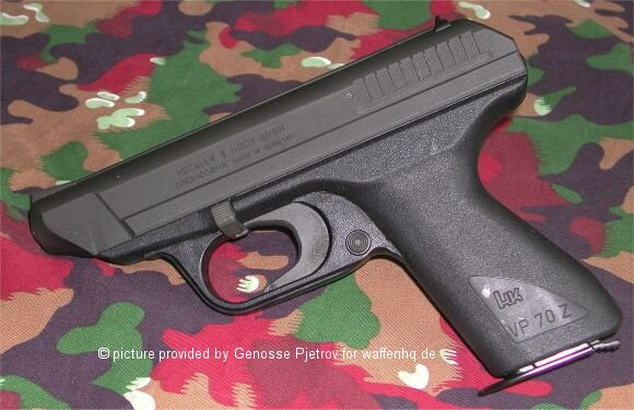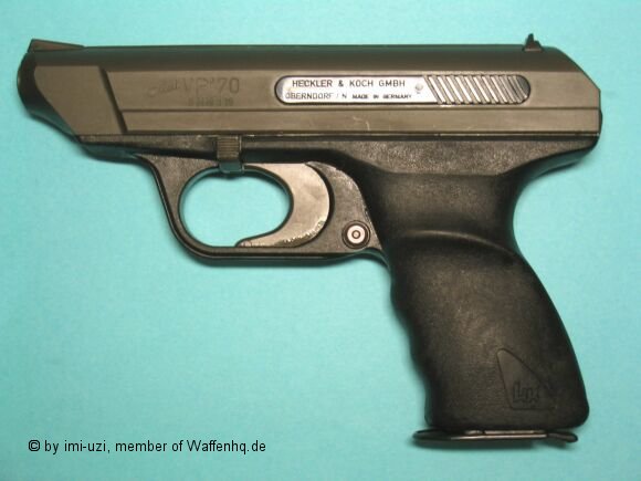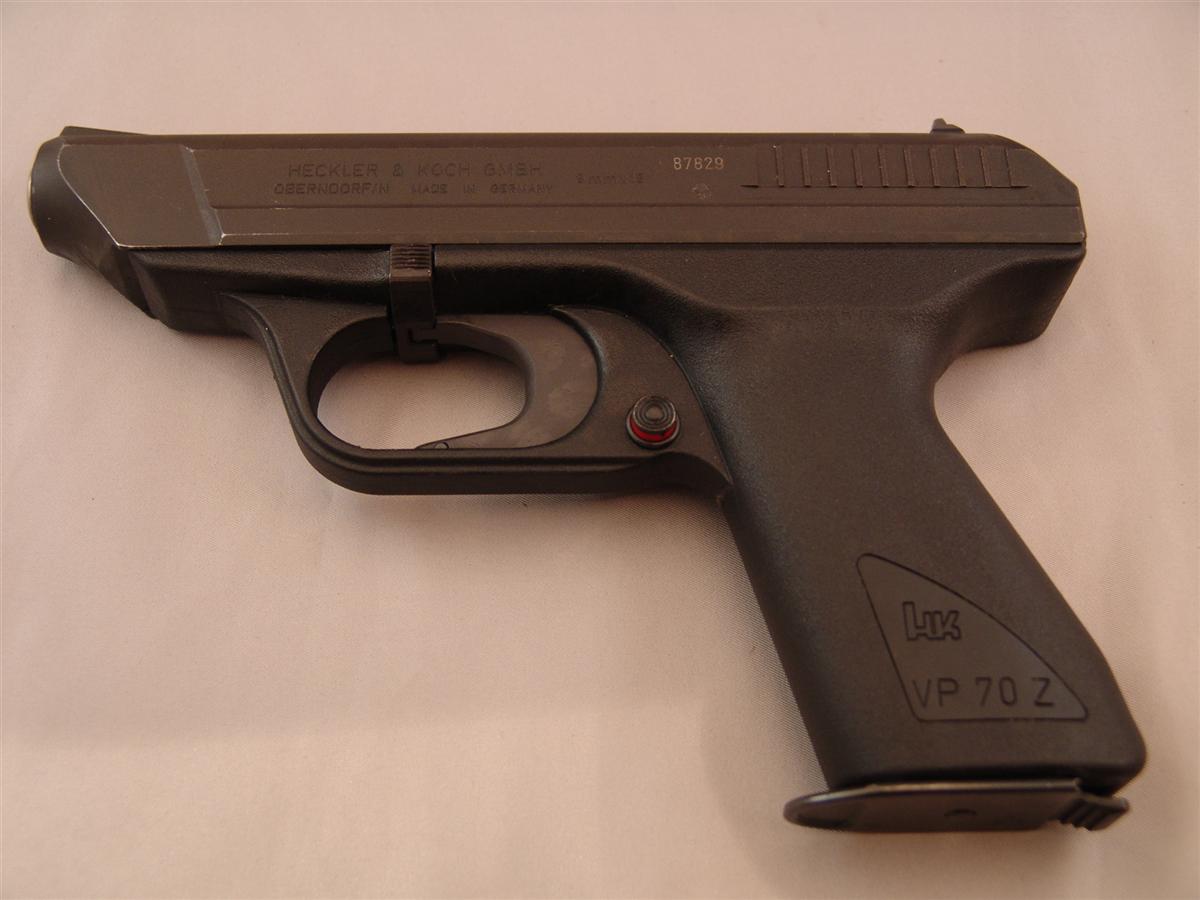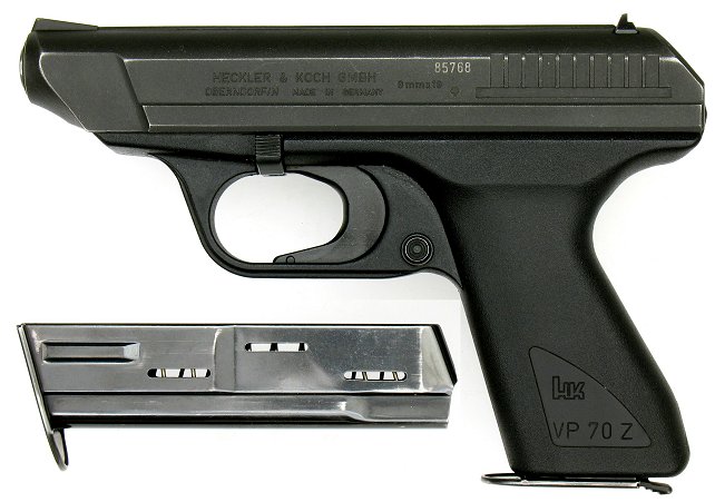 VP是德文“Volkspistole”的缩写,意思是“人民手枪”;70是指正式公开的年份1970年,不过正式推出市场是在1973年。VP70有两个型号,军用型VP70M和民用型VP70Z。除了普遍的9×19mm口径外,VP70还有一种意大利9×21mm口径,这种口径的VP70只生产了约400支,大多数都销往美国。1989年,VP70系列正式停产。在2014年,HK公司推出了一种名为VP9的平移击针式手枪,取名VP9,据称就是专门向VP70致敬的。