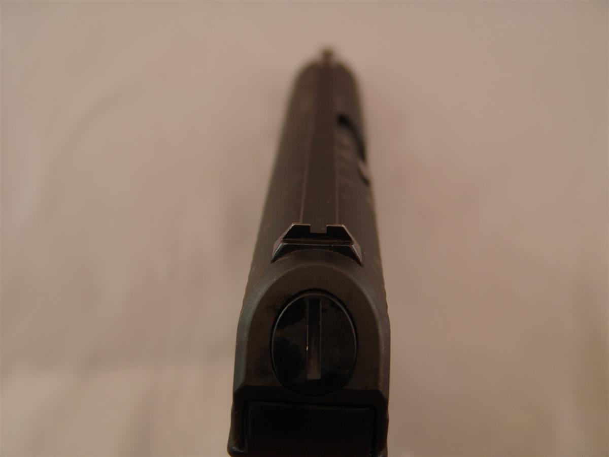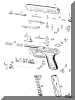 VP70分解时,先取出弹匣,将套筒后拉,检查弹膛和进弹口是否确实无弹,再放回套筒。压下扳机护圈后面的套筒卡笋,向后拉套筒到一定位置,向上抬再向后拉,然后向前推套筒并卸下。将套筒后端的击针套向右转90°,分解出击针套和击针。枪管固定于套筒座上,无须卸下。