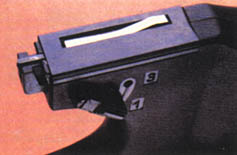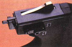 快慢机柄装定在“1”时,手枪与未驳装枪套前一样,只能单发射击。当快慢机柄向上转到“3”时,带动点射曲柄向上抬起,拨齿同时咬住棘轮,连发杠杆也前伸至半自动限制板上,枪套上的点射控制装置机构与手枪连成一体。当扣压扳机后,套筒后坐的同时,压点射曲柄向下,使连发杆制止半自动限制板向上,拨齿也同时拨一次棘轮,如此往复3次,就实现了3发点射;