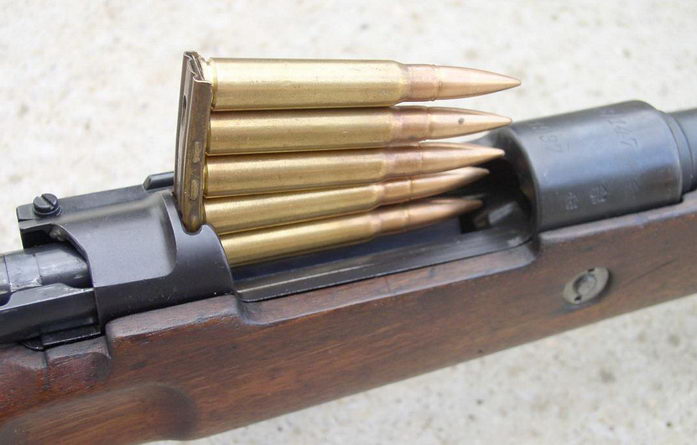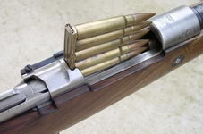 双排固定式弹仓是98式步枪的另一个著名特征,枪弹通过机匣顶部的抛壳口装入。装填枪弹有两种方法,最快的方法就是用桥夹。每条桥夹装5发枪弹,刚好够装满一个弹仓,在机匣环上方有机器切削出来的桥夹导槽,打开枪机后,可以把夹满枪夹的桥夹插在导槽上,然后把5发枪弹用力压进弹仓内。压完弹后,空的桥夹可以用手拨出,但如果不用手拨,在关闭枪机时也会强行抛出桥夹,这样的设计在激烈的战斗中非常有效。另一种方法最简单,只需要打开枪机,用手一发一发地把枪弹压入弹仓内,一次一发。用这种方法装满弹仓会比较慢,但如果在战斗的间隙想把半满的弹仓重新装满,则可以用这种方法。