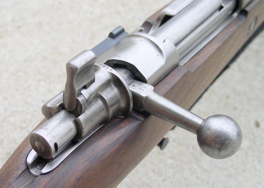 拉机柄牢固地安装在枪机体上,在89式步枪之前的拉机柄在固定在枪机中部,从89式开始参考了李-恩菲尔德的设计而改为固定在枪机后部,直到98式步枪为止,这个拉机柄在枪机闭锁时都是呈水平状态向右直伸而出,只有少数特殊型号(卡宾枪、狙击型和自行车步枪)才是下向弯曲。在1924年研制的标准型步枪上,有部分标准型仍然是使用直拉机柄,直到98k短卡宾枪开始,才统一让拉机柄向下弯曲。下弯式拉机柄不但使步枪在携带时更方便,不容易绊上杂物,而且也使枪机操作时更舒适。