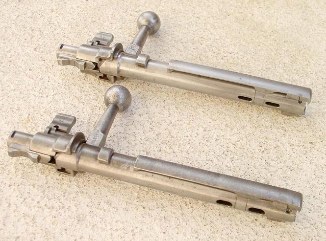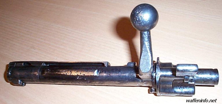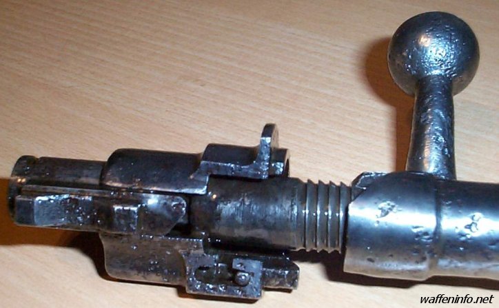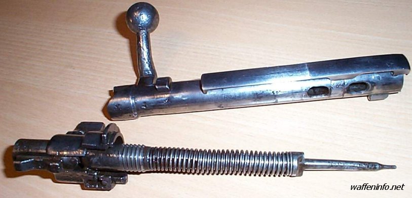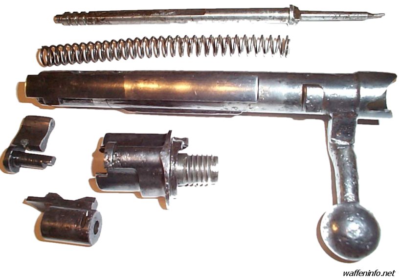 毛瑟兄弟设计的毛瑟式枪机安全、简单、坚固和可靠,甚至于直到今天,大多数的旋转后拉式枪机都是根据毛瑟兄弟所设计的原理来设计的。在枪机上有三个凸笋,两个在枪机头部,另一个在枪机尾部。前面的两个凸笋就是闭锁凸笋,进入枪管尾有些人把尾部的凸笋误认为是第三个闭锁凸笋,但实际上它只是一个保险凸笋,并不接触机匣上的闭锁台肩。枪机组很容易从机匣中取出,在机匣左侧有一个枪机卡榫,打开后就能旋转并拉出枪机。