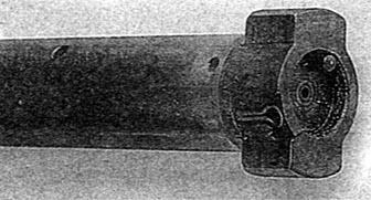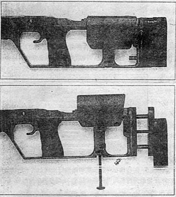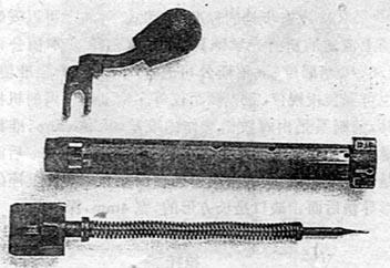 ![]() 枪机分解,拉机柄的叉形件将其推进枪机的圆柱形部分,击针便将其固定,左右变换很容易 |