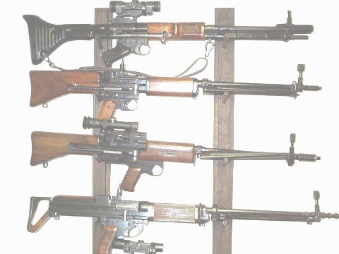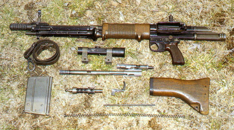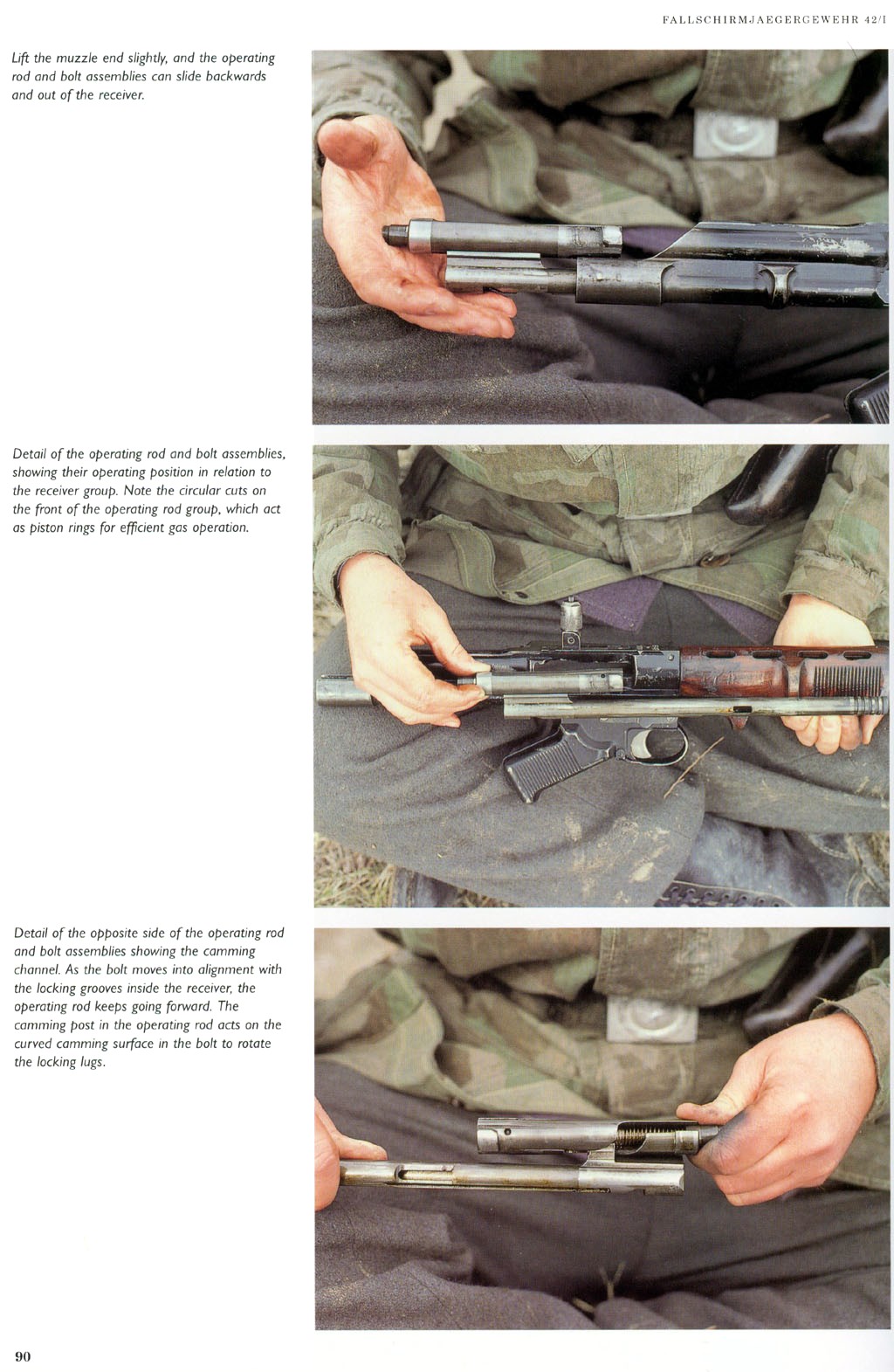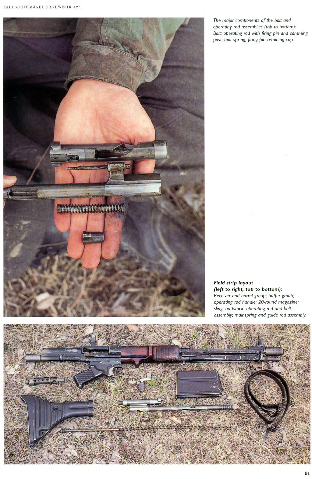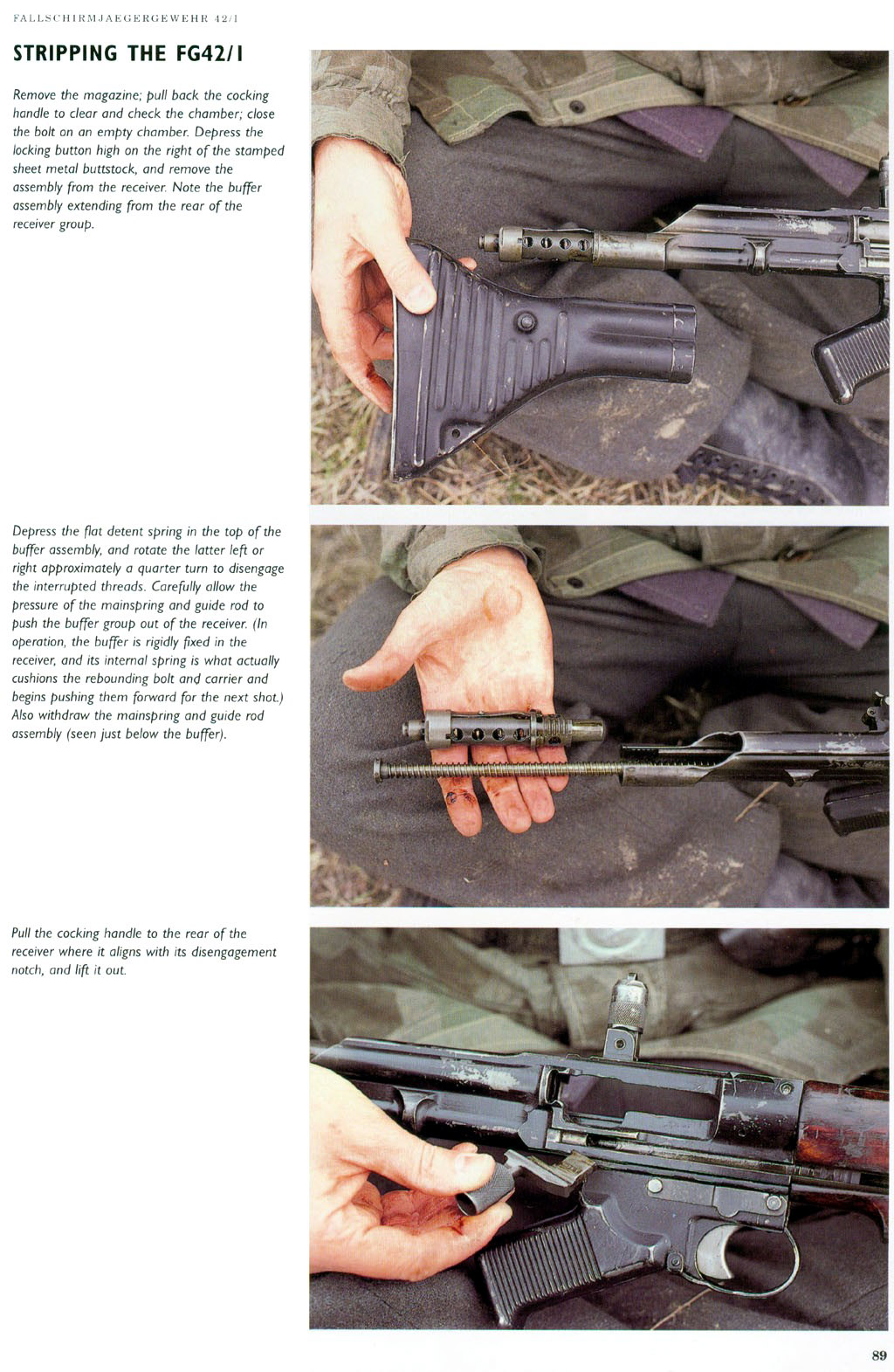 不过如果按照材料和生产工艺来划分,FG42一共有7种型号,前5种型号(从A到E型)是采用机加的钼钢机匣(moly-steel),而最前面的三种型号(A、B、C型)是正式投产前的试验型,稍后的两种生产型则采用不同的枪托材料(D型是用铝合金,而E型是用薄钢片)。而最后的F型和G型均采用低碳钢机匣,而且为了节约宝贵的金属资源,还改用了木制枪托,其中F型是采用新型冲压机匣的试产型。值得注意的是,由于材料和工艺上的变化,在A型和E型之间及F型和G型之间,其零部件都不能互换。