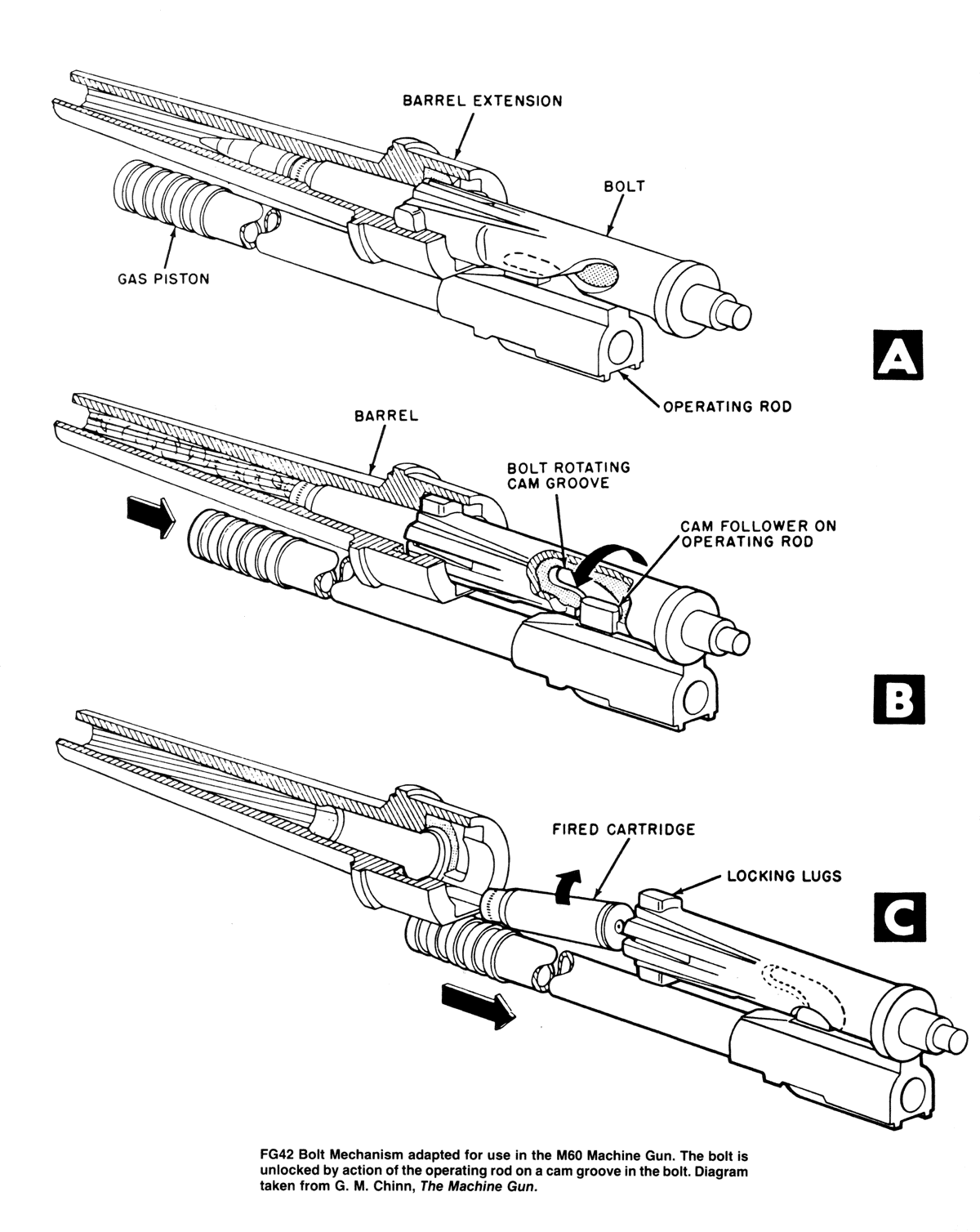 FG42是一种导气式操作原理的自动武器,长行程导气活塞位于枪管下方,回转式枪机有两个闭锁凸笋。在FG42-2的导气系统上还增加了一个气体调整器,以便在不同的气候条件也能可靠地运作。