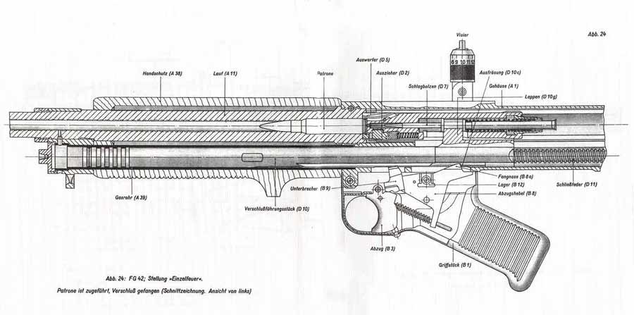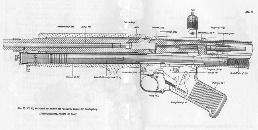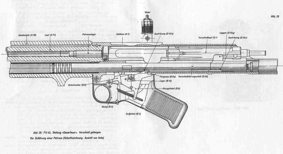 FG42的击发机构很有意思,当步枪在半自动状态时采取闭膛待击的方式,这样是为了提高单发射击时的精确性;而在全自动模式时则变成开膛待击,这样可便于冷却枪膛。FG42结构上最大的特征是弹匣从机匣左侧水平插入,弹壳从右侧抛出。FG42-2还在抛壳口后增加了一个弹壳导向板(使弹壳斜向抛出远离射手的脸部),而在弹匣入口处有一个弹簧定位的防尘盖。两种型号的FG42都有枪口制退器,但各自采用不同的设计。