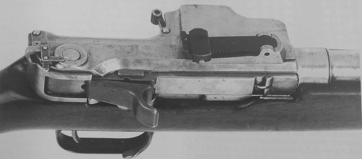 海涅曼Gewehr28的右侧近景,展现了肘节枪机的细节。注意枪管后部顶端的数字“7”。