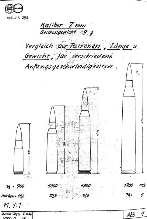 MWK-SB 258中的绘图,展示了提出的4种不同的莱茵金属7mm航空机枪弹及它们的全长(mm),重量(g)和枪口初速(m/s)。通过报告中列出的表格,弹壳长分别为39mm,81mm和110mm。