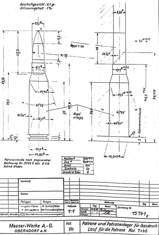 注意口径数据图表左侧解释枪弹尺寸(Patronenmaße)是来自DAG施塔德恩(靠近纽伦堡)分部的5169号绘图。