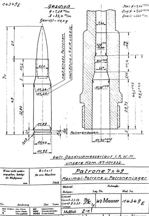 毛瑟的RWM7×49mm枪弹及其弹膛尺寸的绘图,日期标注为1933年3月2日。