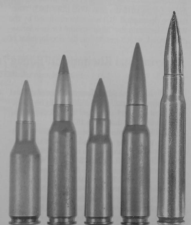 一些早期中间威力弹,最右面是7.92×57mm标注步枪弹,作为对照。左起: