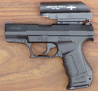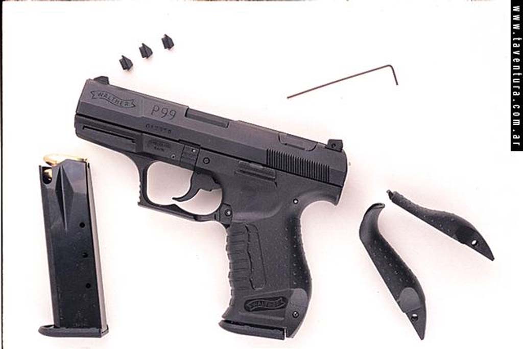 在底把前方有类似USP手枪的附件安装导轨,可方便安装各种战术灯或激光指示器。在右侧附件导轨下面通常有由两个字母所组成的日期代码,表示该底把生产年份的最后两位数字,字母从A至K分别代表0至9,例如一把写着“AE”代码的P99,则表示该枪在2004年生产(AE = 04)。扳机护圈旁边有弹匣卡笋和分解卡笋,分解卡笋在扳机上方,杆式弹匣卡笋在扳机护圈根部。瓦尔特公司还向P99的用户提供延长尺寸的弹匣卡笋,让有需要的射手自己更换到枪上。扳机护圈尺寸较大,戴厚手套也能射击。除挂机柄只方便右手射手外,其他操作部件都适合左、右手射手使用。后来在2004年推出了一种重新设计的P99,改进的板机护圈取消了“圆拱”形线条。重新设计也套筒让射手可以更容易抓紧它,附件导轨也改变了类型,使之与市场上的手枪附件更通用。普通的P99底把都是黑色的,但最近瓦尔特公司推出了一些绿色或沙漠黄的P99底把,采用这些底把的P99被命名为“军用型P99”,当然这个名称只是个商业喙头而矣。