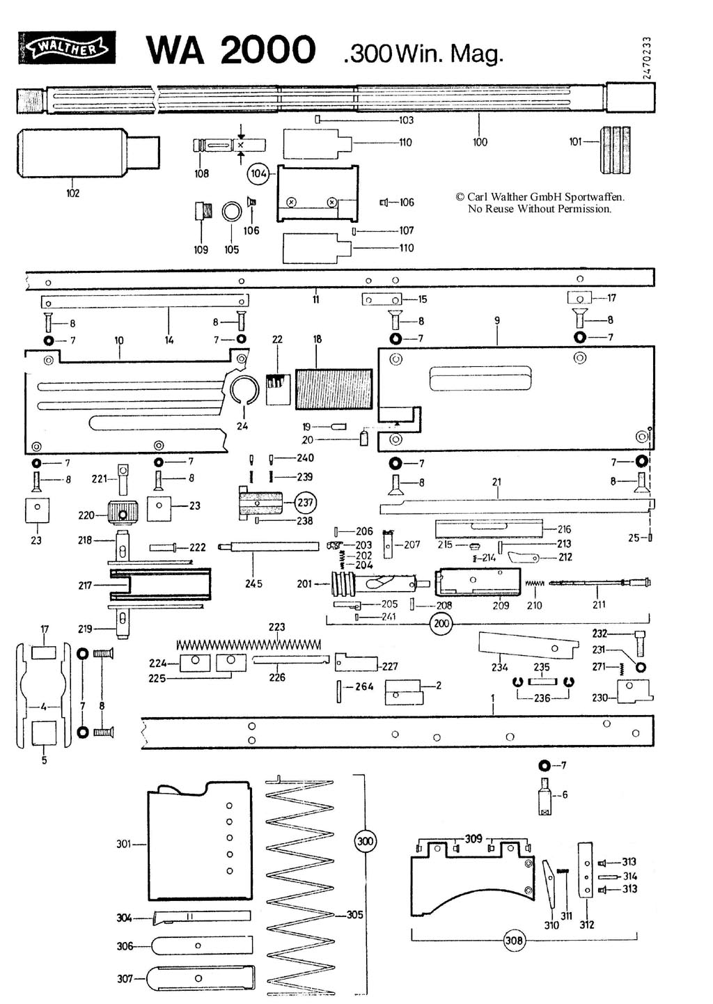 WA2000是一种半自动步枪,采用导气式回转枪机,短行程导气活塞位于枪管下方。机头有7个螺纹形的闭锁凸耳,机头进入弹膛尾部闭锁。