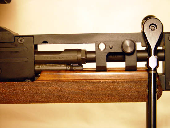 沉重的比赛级枪管为自由浮置式,螺接在机匣上,位于两根铝合金支柱构成的步枪框架之间,在步枪框架下面有木制前托,框架上面有瞄准镜架和两脚架安装点。