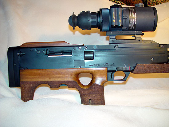 WA2000狙击步枪没有机械瞄具,配用可快速安装拆卸的瞄准镜。通常配的是施密特-本德的2.5~10x可变倍瞄准镜。在夜间使用时可安装PV4夜视瞄准镜。