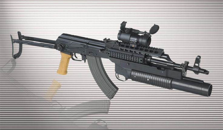这张图片中是AKM63F加装B&T的导轨系统及新加坡CIS的M203榴弹发射器