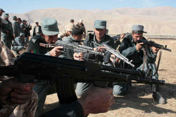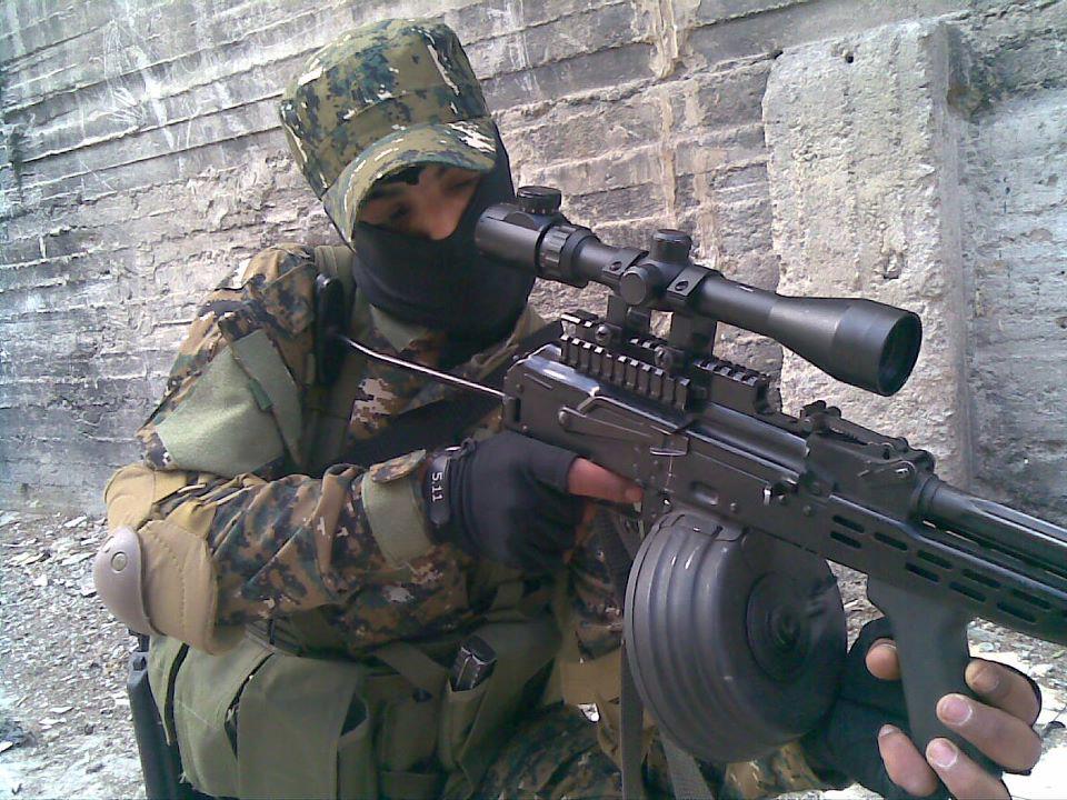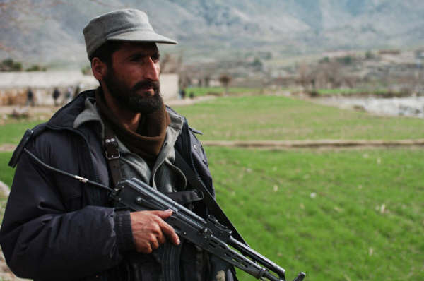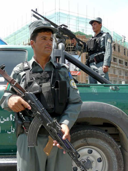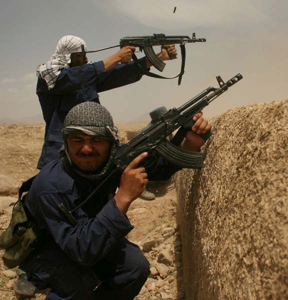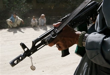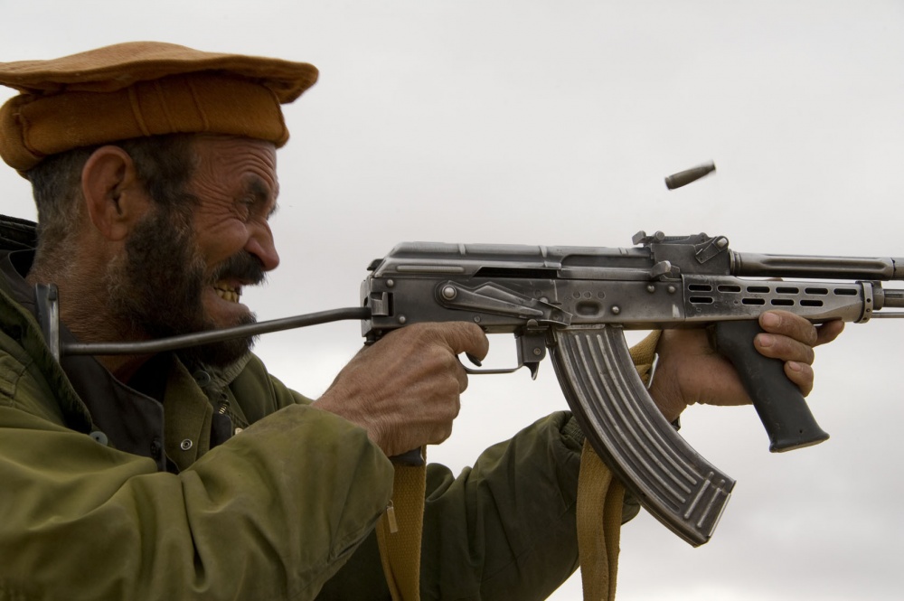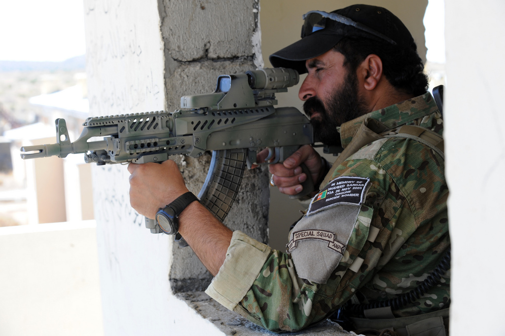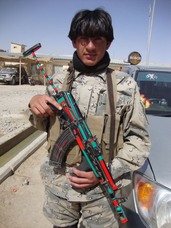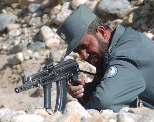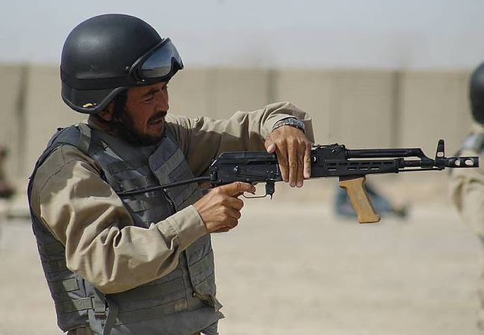 这个阿富汗警察把他的AMD-65的前握把换成AK-63的木制握把