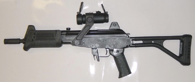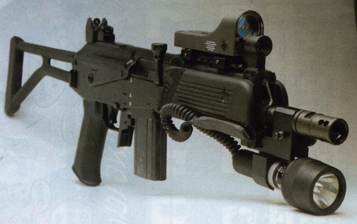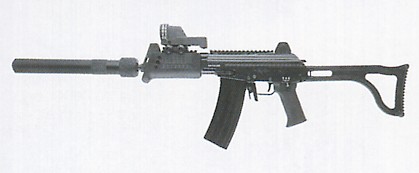 这是加利尔MAR一个以反恐怖部队为使用对象的较为少见的战术改进型,它换了一个有更好隔热性的新护木,护木上方能安装Trijicon公司的ACOG反射式瞄准镜,前下方能加挂战术灯,消焰制退器也经过改进,可以安装快速拆卸式消声器。
