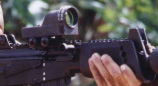 这张局部放大的照片可以看到机匣和护木顶部的M1913导轨,这里机匣上安装的瞄准镜是Meprolight公司产品——Mepor