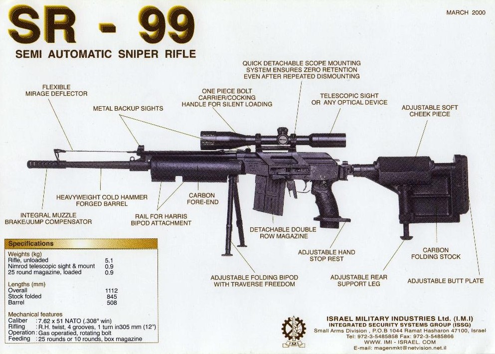 在推出加利尔狙击步枪(GALAT'Z)十年后,以色列军事工业公司又推出一种加利尔的半自动狙击步枪——99 Sniper Rifle(简称99SR)。