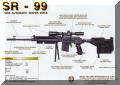 99SR的设计思想是在战斗中向多个目标迅速投射精确的持续火力,外形上99SR与GALAT'Z最大的不同在于护木和枪托。99SR的折叠式枪托是由碳纤维材料制成的,贴腮和底板可调整,并带有一个可调高低的后支架。圆柱形的护木也是碳纤维材料制成,碳纤维的好处是减轻了重量,99SR的空枪重是5.1公斤,而GALAT'Z是6.4公斤。不过99SR并没有提高GALAT'Z的精确度,散布精度仍然为1.5 MOA,实际上,99SR的枪管就是GALAT'Z的508mm重型枪管,同样是配El-Op Nimrod 6×40光学瞄准镜,99SR根本就是GALAT'Z的碳纤维材料改进型。