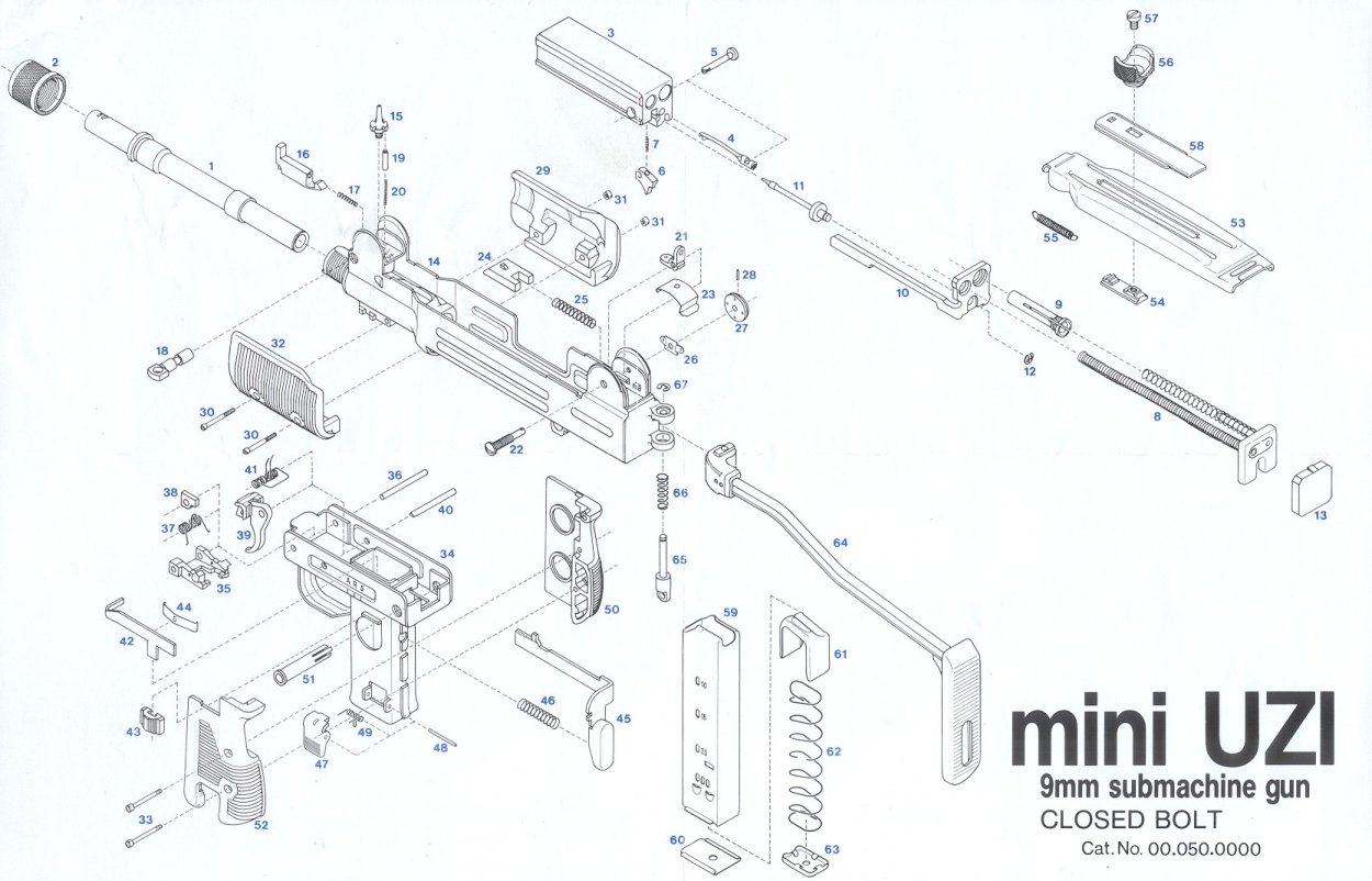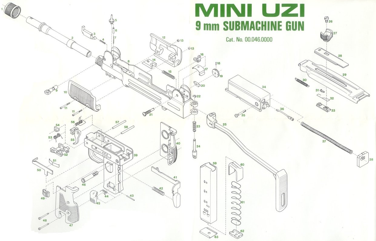 Mini Uzi的零件爆炸图,左边是开膛待击型,右边是闭膛待击型