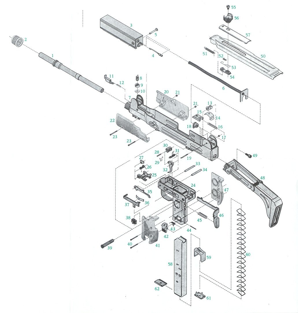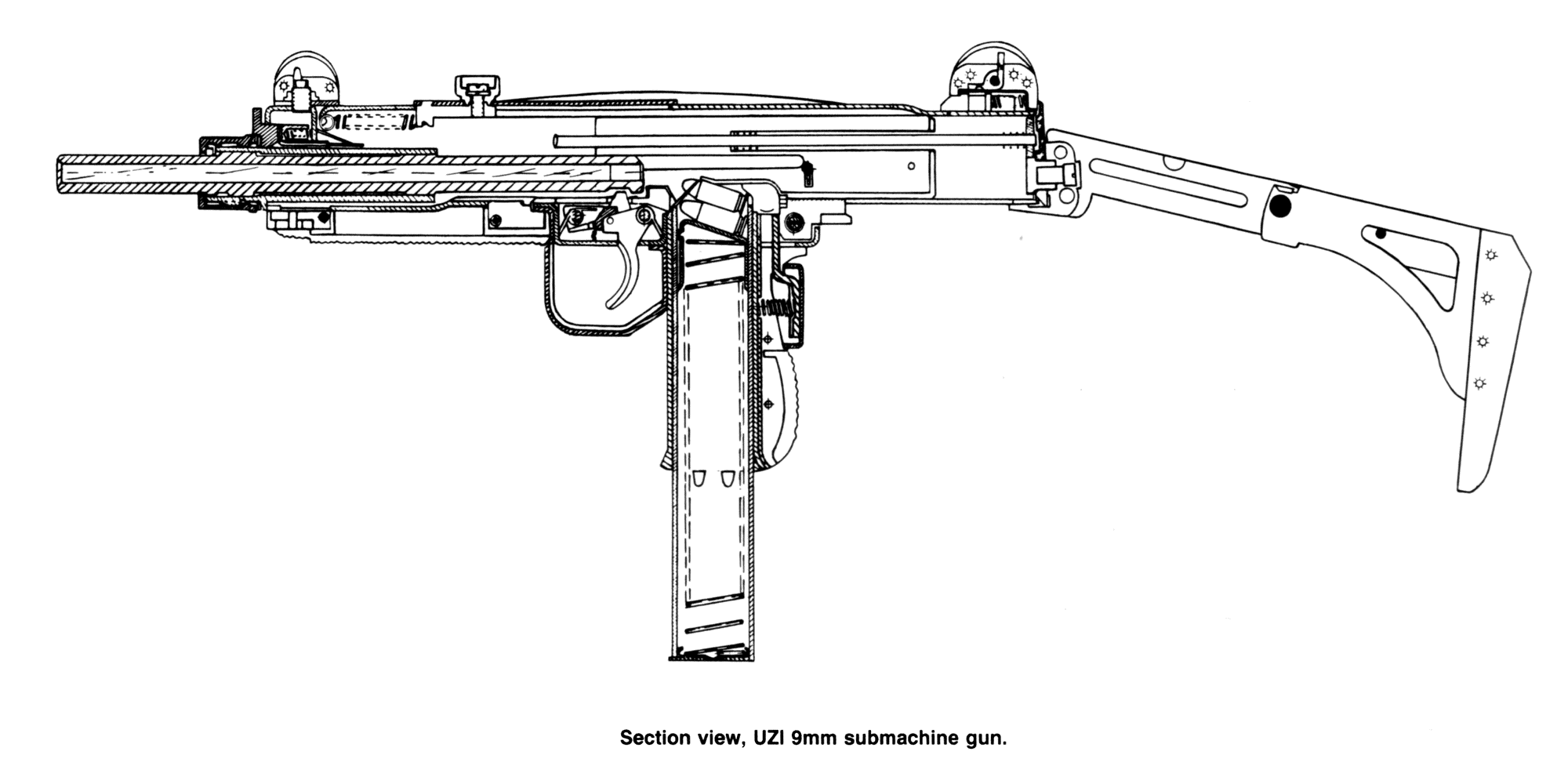 Uzi冲锋枪的标准型安装有260mm长的枪管,最初配有木质固定枪托,后来改为Z形的下折叠金属枪托。由于枪机行程比较长,它的理论射速为每分钟600发左右,如果是.45 ACP型的射速则是500发/分。由于射速比较低,因此即使不把快慢机装定到半自动,也能比较容易控制出单发。Uzi冲锋枪配备有刺刀,但实际应用中比较少见。