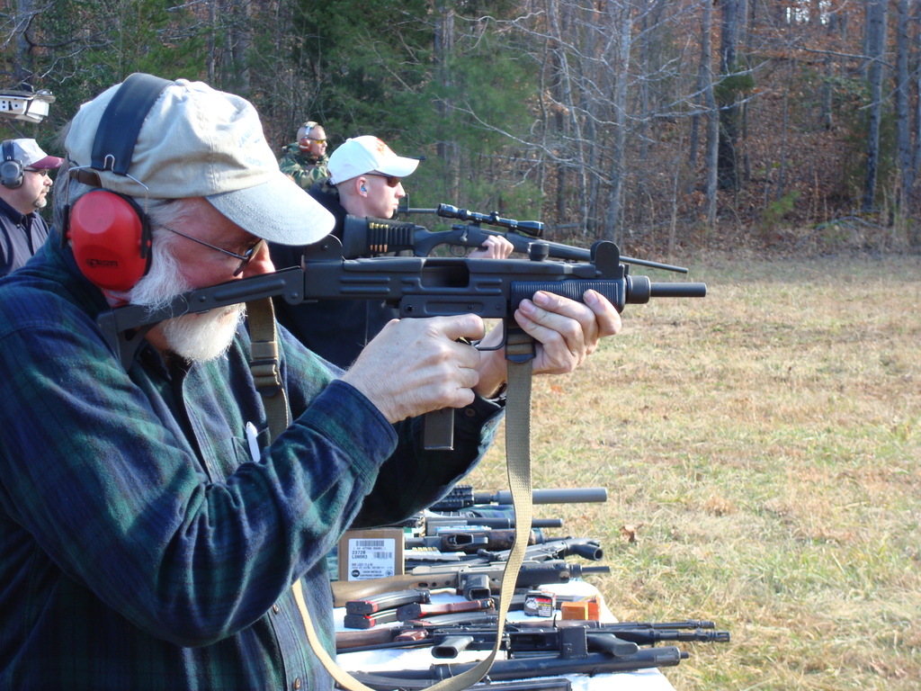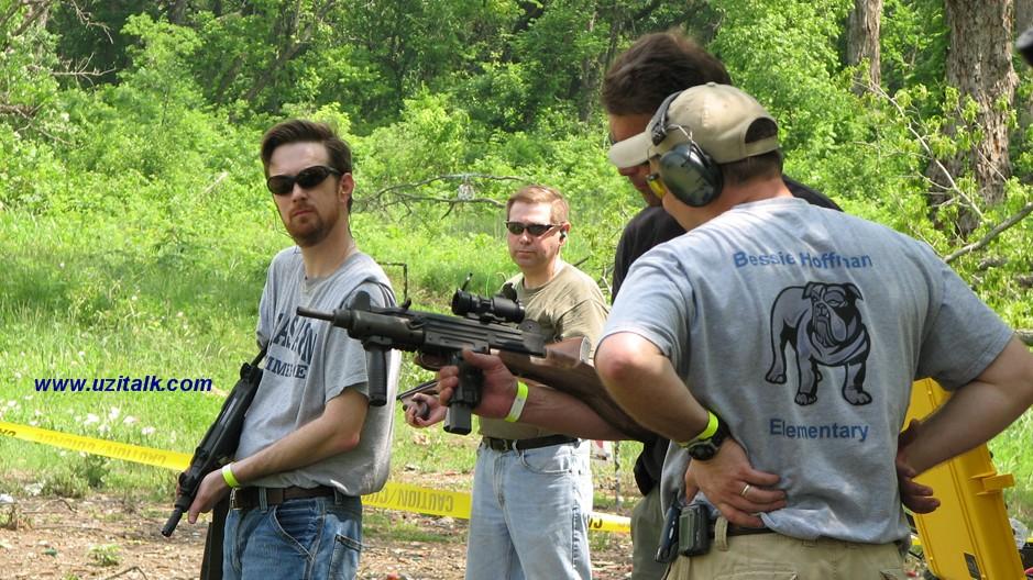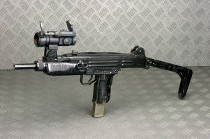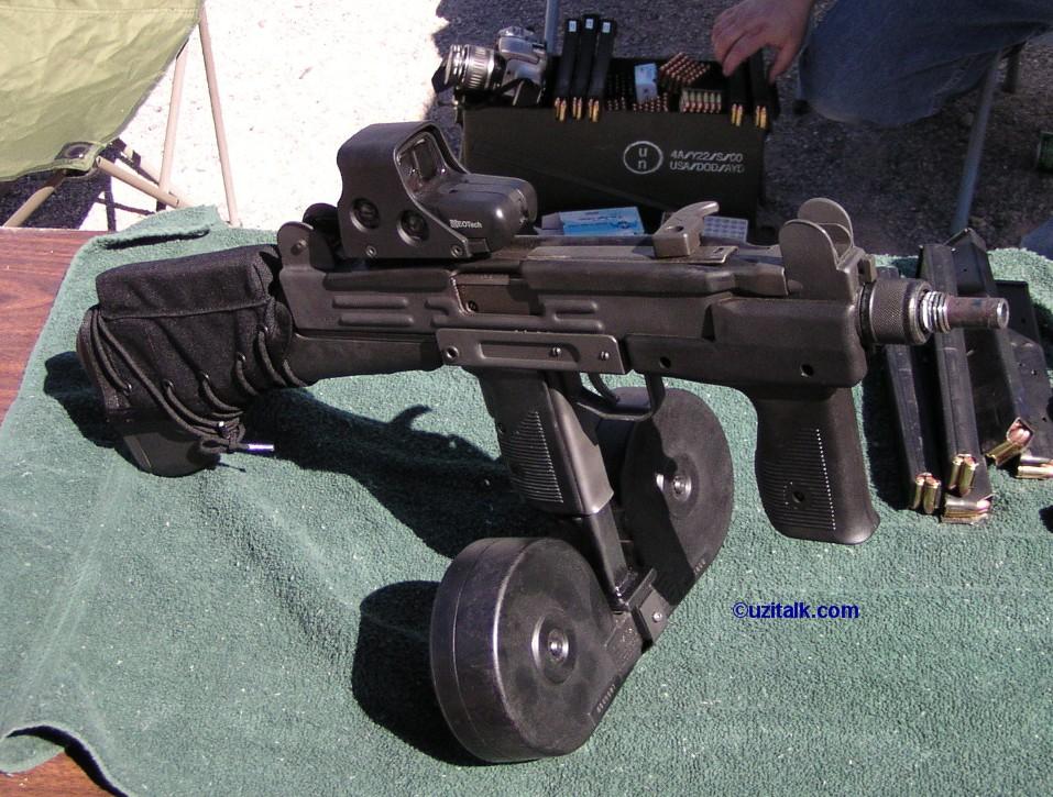 不方便在顶部安装瞄准装置是Uzi的缺点之一,这是在准星座上固定一个Aimpoint的DIY做法