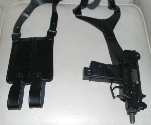 包括两个弹匣包的Micro Uzi专用腋下枪带,但此图中挂着的是Uzi手枪