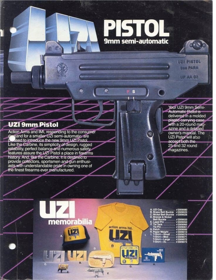 该枪由Action arms公司进口在1984年开始进口到美国,有9mm,还有.45 ACP两种口径型号,并且有.41 AE口径的转换套件。1989年Action arms公司不再进口.45口径型Uzi手枪,到了1993年美国联邦立法禁止9mm型的Uzi手枪继续进口。由于美国可以进口Micro-Uzi冲锋枪供执法机构使用,所以有些枪匠就把Micro-Uzi冲锋枪改装成Uzi手枪出售。另外,还有一家叫Vector Arms的公司则把Mini-Uzi改成半自动和取消枪托,变成Mini-Uzi手枪出售。