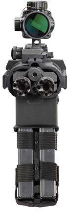 不过,基利波“蛇”虽然有两组枪机,但从图中判断其只有一套导气装置,估计两根枪管的导气孔是通向同一个导气室。所以有可能是改变了APR的活塞组,使之能适应双倍的导气量;也可能是缩小了每一根枪管上的导气孔,减小了从每根枪管上泄出的导气量。不过如果只安装一个弹匣射击,或是使用时其中一边的动作机构发射故障(例如卡壳)时,另一边的动作机构是否还能可靠地完成自动循环?目前在官方的宣传资料中完全没有提到这样的细节。