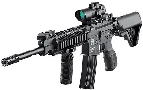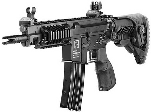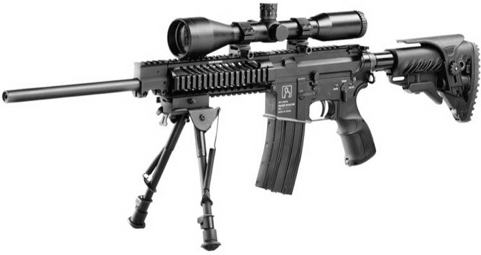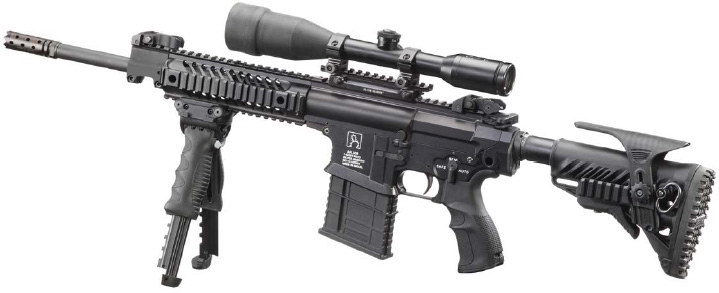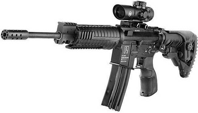 基利波DMR(Designated Marksman Rifle)是这个系列中的5.56口径狙击型,为了保证射击精度,DMR型只有气吹式原理一种,枪管长为18英寸。虽然叫DMR型,但也是有全自动或半自动两种类型。