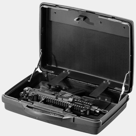 基利波APR的专门枪箱,箱子的提把与枪连在一起,虽然不能在箱子里发射,但一按下提把上的开关,箱子就能迅速和枪分离