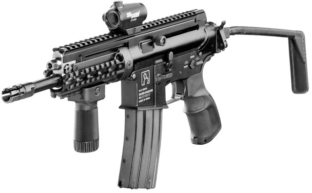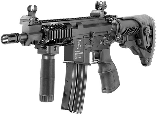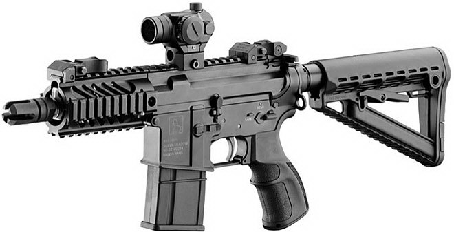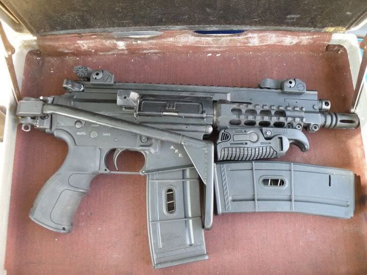 APR是“突击手枪步枪”(Assault Pistol Rifle)的缩写,枪管长165mm。所谓的手枪,其实是北美法律意义上的“手枪”。美国的法律对于枪管长度短于16英寸却又有肩托的武器管制得较严,然而在对手枪的定义上却又是没有枪托,于是那些喜欢玩儿短枪管步枪又要绕开3级武器限制的人,就想出了把极短枪管的步枪去掉枪托变身成手枪的方式去钻法律空子。而基利波APR在不安装枪托时就是一把“手枪”,装上了折叠式枪托后又成了3级武器的短枪管步枪。由于传统的AR式结构的复进簧位于枪机后方,因此机匣尾部要伸出一根管子。而为了缩短长度,APR只有短行程活塞式型号,且把复进簧移到机匣顶部。无论安不安装枪托,都有全自动或半自动两种类型。