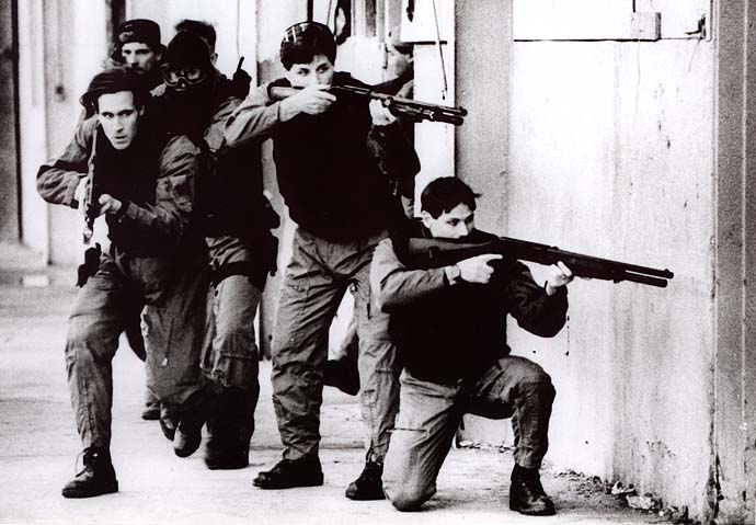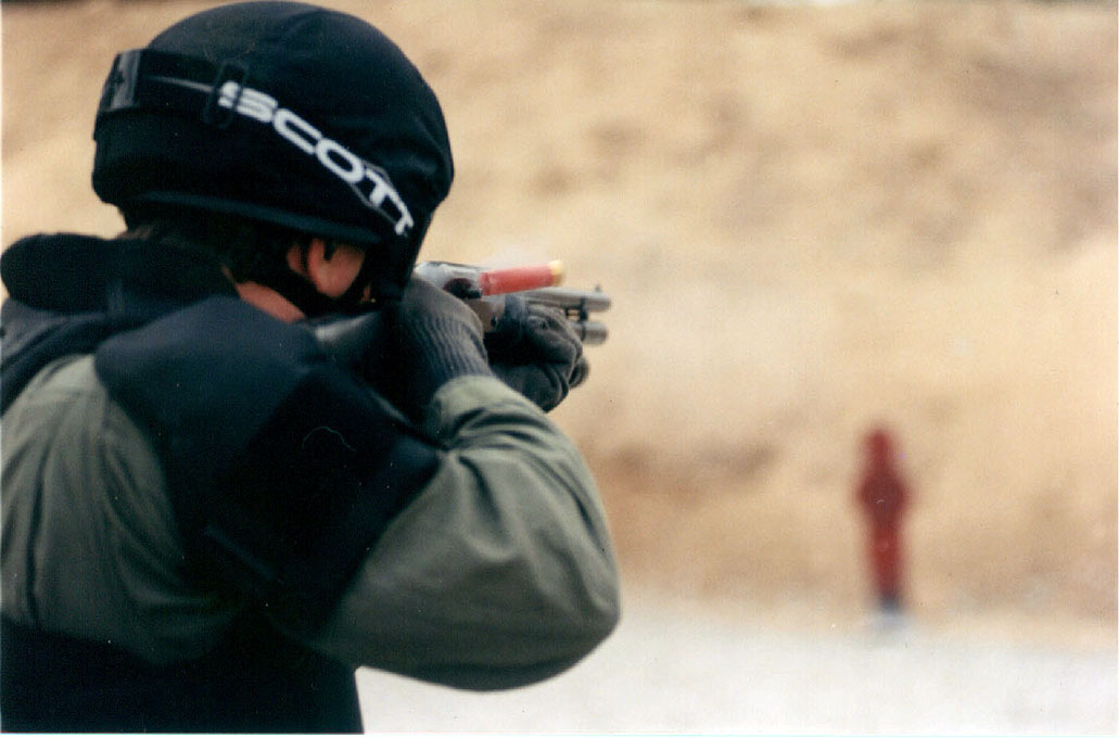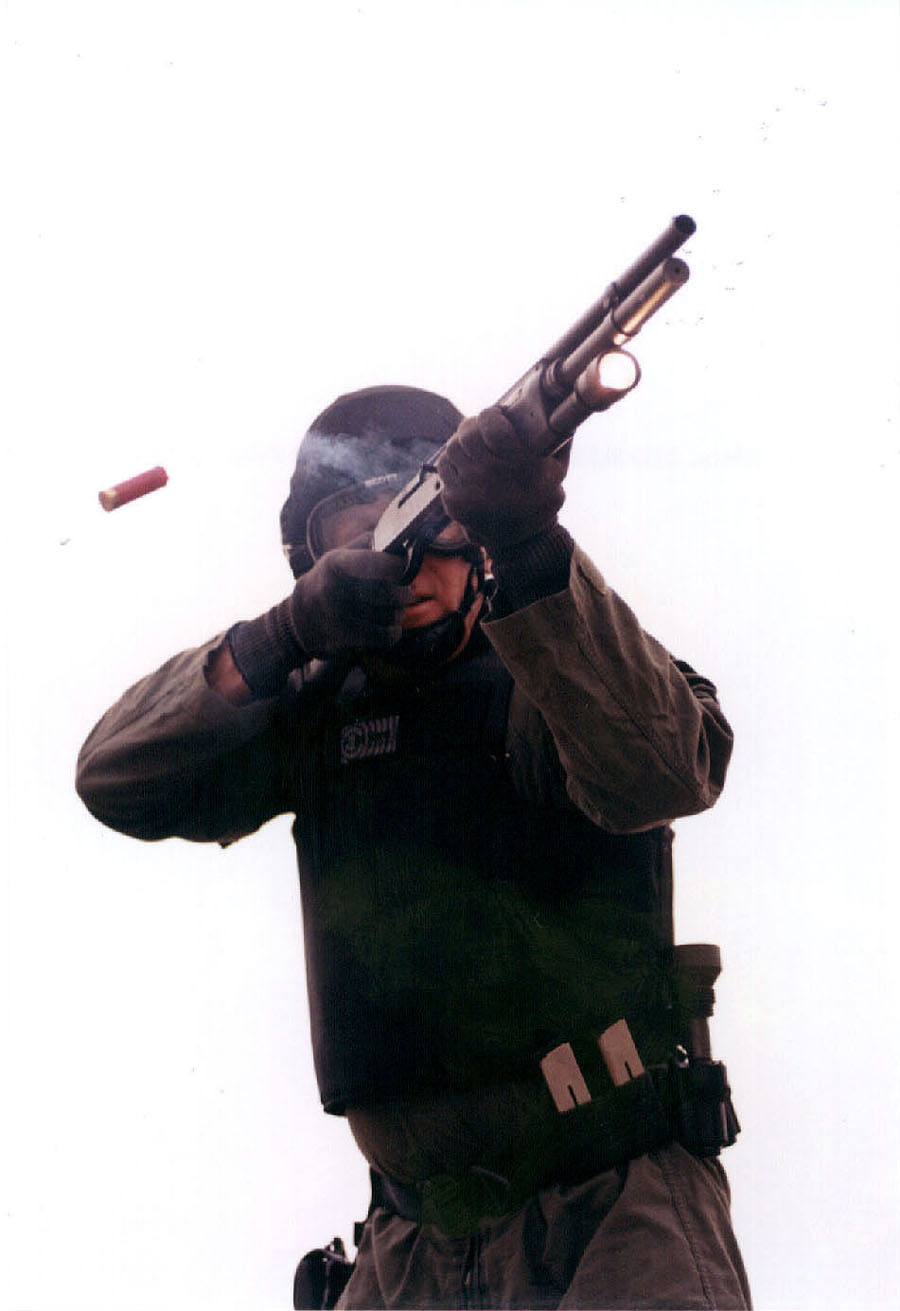 这两张照片是一支名为CCI的的特警队用M1超级90进行突入建筑物训练的照片。