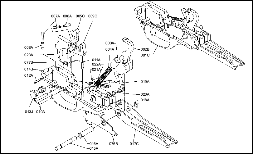 发射机组件及分解图:001C-发射机组件;002B-击锤;003A-击锤簧帽;004A-击锤簧;005C-单发阻铁;006A-单发阻铁簧杆;007A-保险簧;008A-保险簧套;009C-扳机;010A-扳机轴;011A-扳机簧;012A-保险簧销;013J-保险;014B-发射机座;015A-发射机轴;016A-发射机轴套;017C-托弹板;018A-弹簧档圈;019A-供弹杆;020A-供弹杆轴;021A-托弹板簧;022A-托弹板簧杆;023A-单发阻铁轴;076B-控制杆