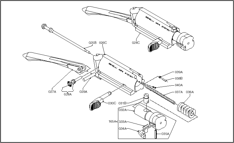 枪机组件及分解图:024C-枪机组件;025B-击针;026C-枪机体;027A-复进簧顶杆;028A-击针销;029A-连接销;030C-拉机柄;031B-开闭锁滚柱;032A-机头;033A-抽壳钩簧;034A-抽壳钩;035A-抽壳钩轴;036A-惯性簧;037A-击针簧;038B-拉机柄定位簧;039A-拉机柄定位销;040A-定位簧销;165A-机头组件