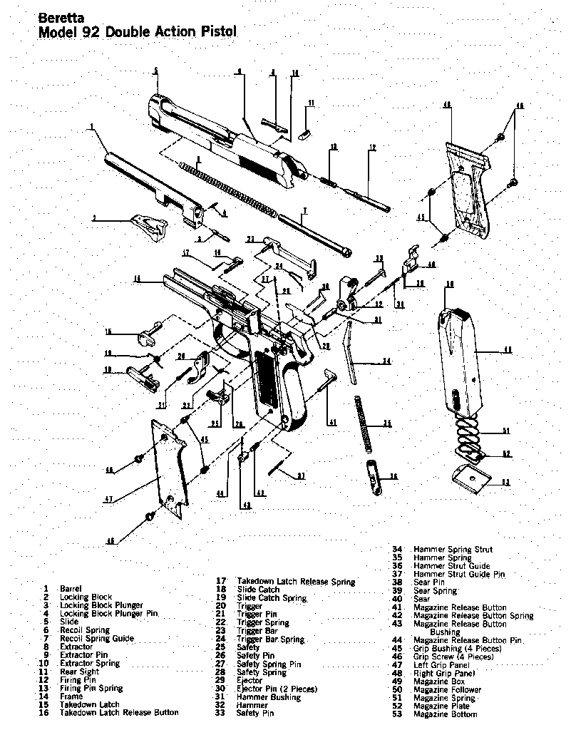 伯莱达92D与92FS型基本相同,只是92D采用了纯双动(DAO)的板机系统,而且没有手动保险。由于没有单动击发的能力,因此92D采用了不外露的短击锤。推出这种型号是因为有一种理论认为警察很适合携带DAO的手枪执勤,DAO的手枪优点是拨枪快速反应射击的速度比较快,而且每一枪的扳机力都相同,因此可以提高命中率。