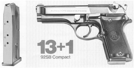92SB Compact即92SB紧凑型,采用短的套筒和握把,使全长减少到197mm,弹匣容量也减少到13发,但92SB Compact也能使用92SB的15发弹匣。