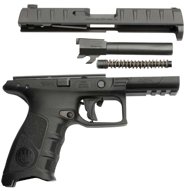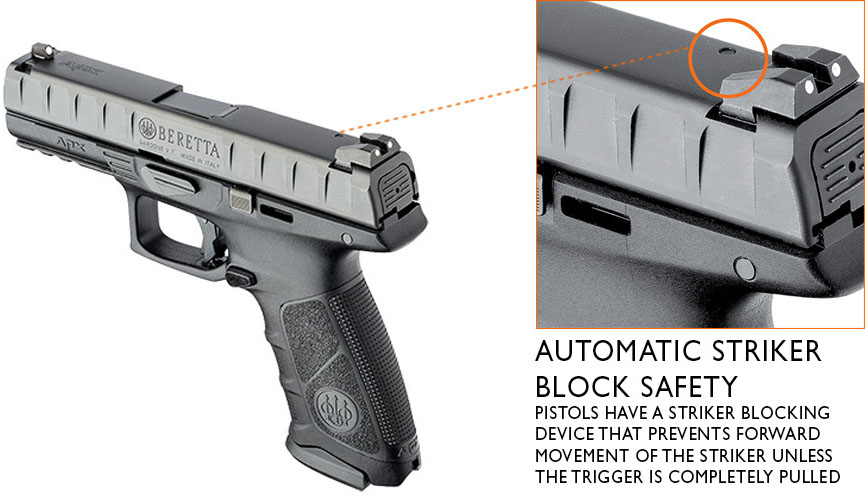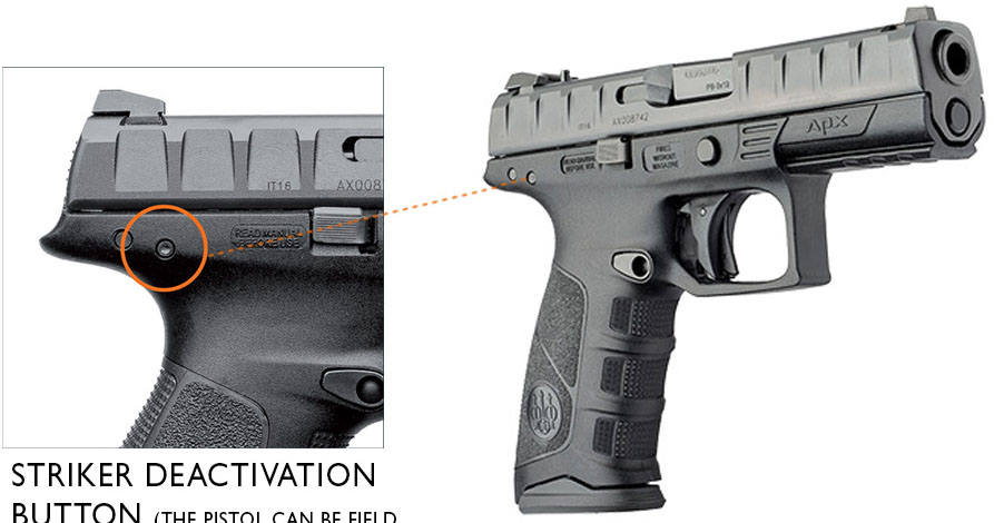 该枪采用改良自勃朗宁闭锁的偏移式枪管原理,击发机构是平移式击针,发射机构是带有自动扳机保险的回转式扳机。这个扳机保险的设计概念来自于Glock手枪,但在具体设计上,伯莱塔回避了格洛克的专利。伯莱塔在宣传资料中强调其分解过程更安全,不需要先扣下扳机释放击针,这一条其实是专门针对格洛克手枪的缺点而说的,因为格洛克就APX的对标产品。APX也是采用与格洛克相同的“半双动”的待击形式,即手枪上膛后,击针会预压一部分行程,当扣下扳机时,击针才后退到待发位置,同时自动打开击针保险,扳机继续扣到底就释放击针。但分解前,必须先释放击针,否则套筒就取不下来。APX不用“先扣扳机再分解”的做法就是在枪尾增加了一个解脱击针待击状态的小按钮,这个按钮要用尖细的东西去捅才能起作用,这样可以避免日常使用时误触而使得击针解脱。当需要分解枪支时,才用尖细物体去捅这个小按钮,安全地释放击针,然后就可以分解套筒出来,这样即使分解前忘记清枪,也不易走火。另外,该枪的击针保险顶部与套筒顶部平齐,当扣动扳机时,联动的击针保险会被抬起,突出于套筒顶部。