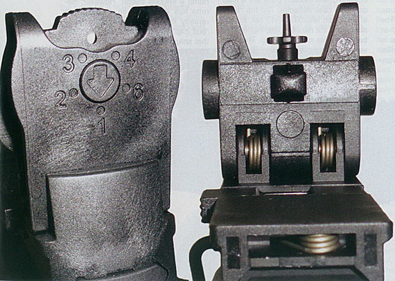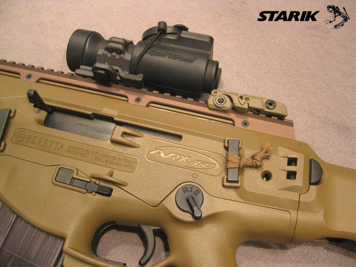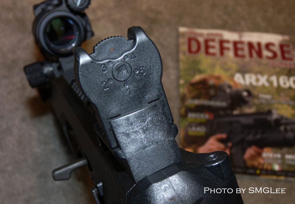 在机匣的顶部,有全长的M1913皮卡汀尼导轨。机械瞄具在不使用时可以折叠放倒。准星为柱形带护翼,准星结构的设计和M16一样,可旋转调节高低。觇孔照门采用转盘式的表尺,分别有100米、200米、300米、400米和600米共5个觇孔。意大利军队装备的ARX-160一般配Aimpoint M2红点镜或ACOG瞄准镜。