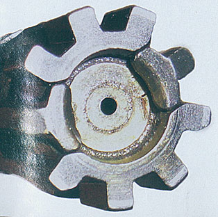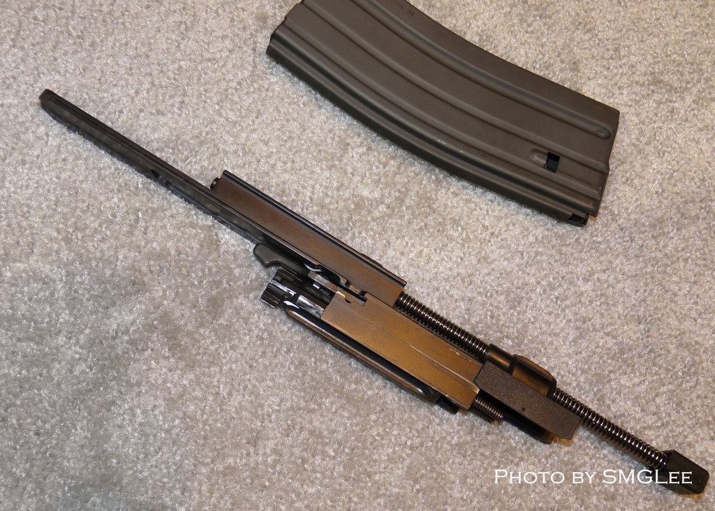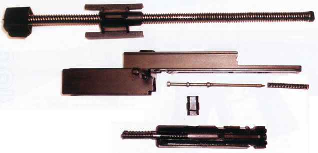 ARX160独特的枪机头及枪机组,可以看到枪机头上有对称布置的抽壳钩,当其中一组抽壳钩用于抽壳时,另一组则充当顶壳杆