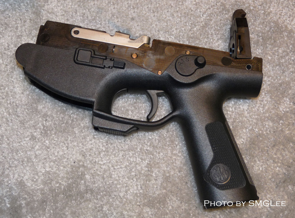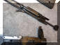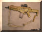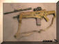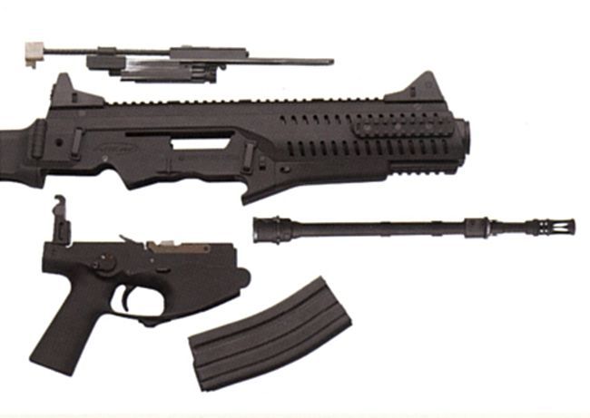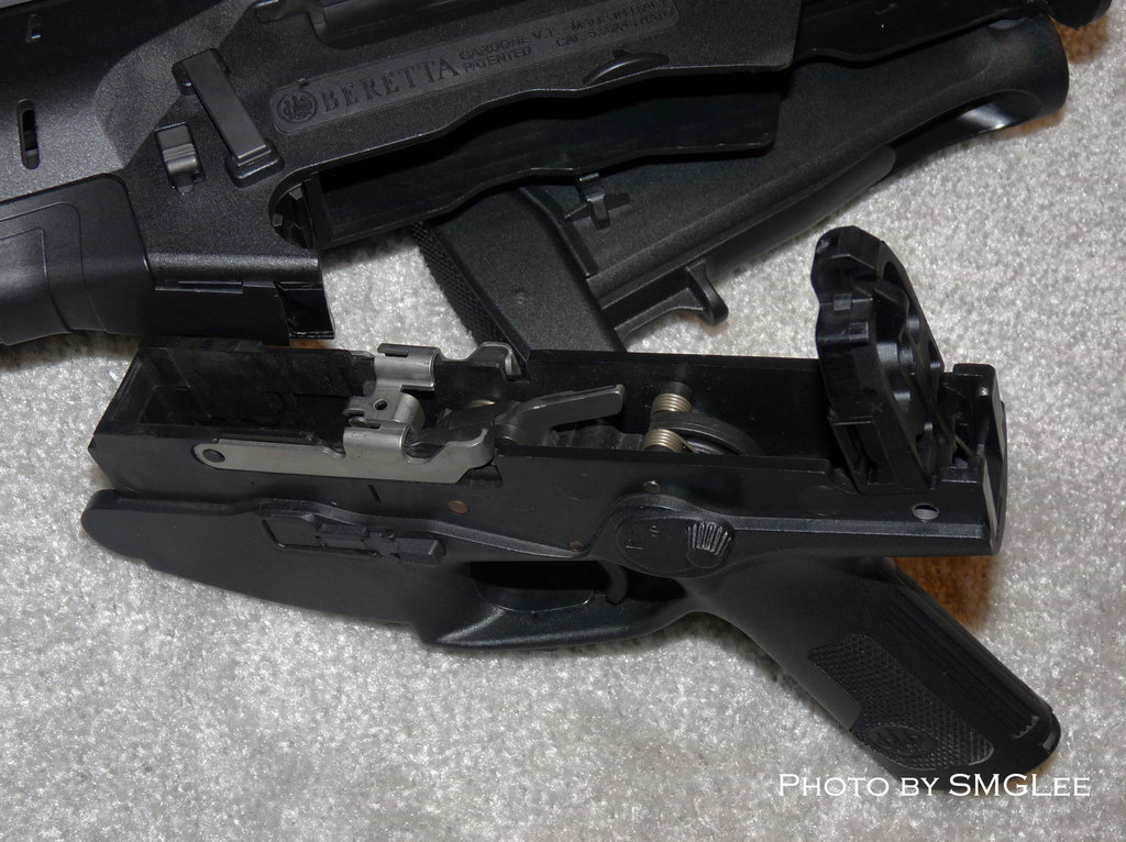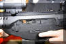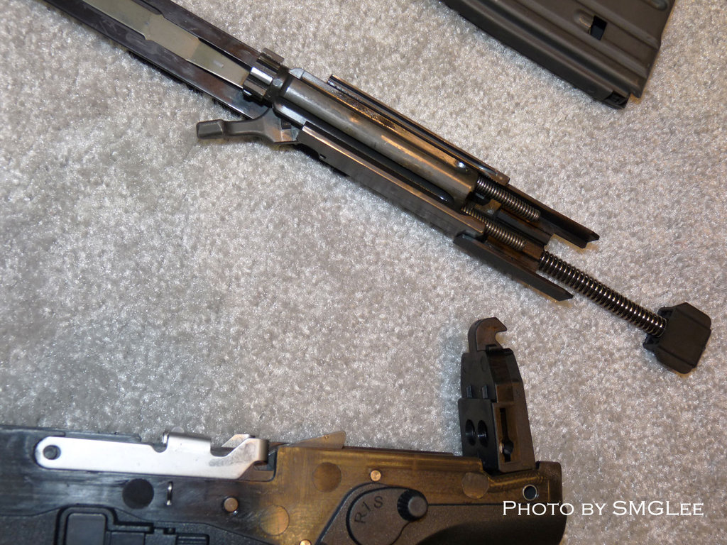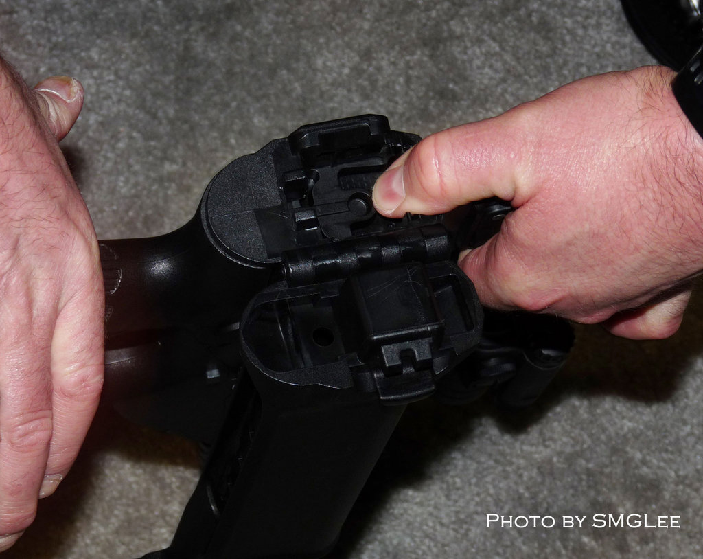 武器的分解操作很简单,不需要任何工具。先卸去弹匣清空枪膛,折叠枪托露出机匣的尾部,然后按下在这里露出的机匣尾档板,再按下机匣尾两侧的杠杆形固定卡扣就能把上下机匣分开。从上机匣里取出枪机和复进簧组件,再按下机匣前端两侧的枪管卡扣就能拆卸出枪管和活塞组件。