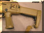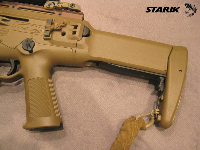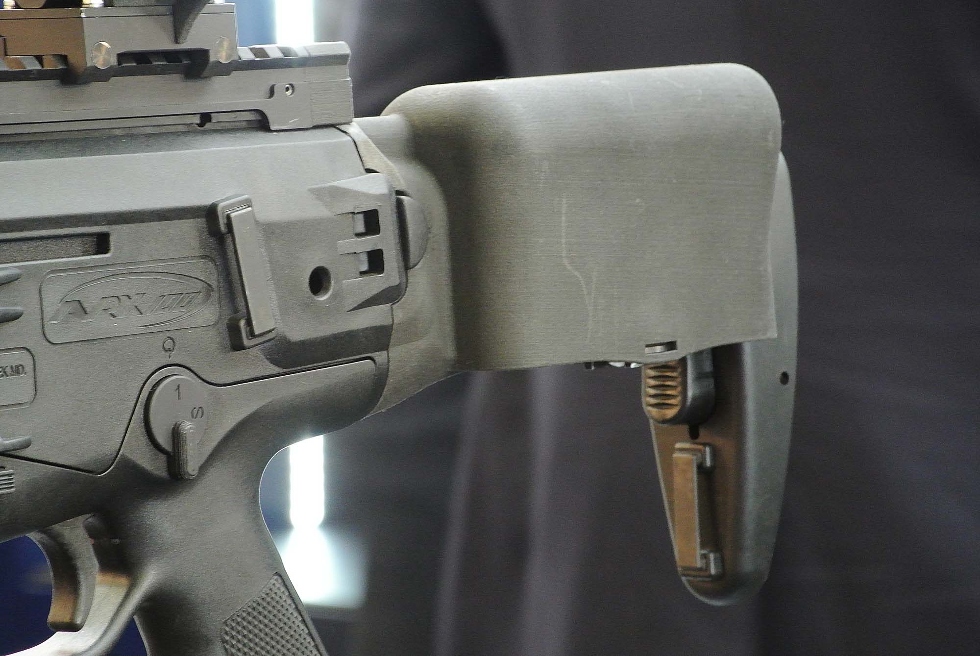 枪托的功能参考了FN SCAR,既可以折叠到枪身右侧,也可以伸缩调节长度。枪托不使用时折叠是为了缩短全枪的携带长度,而由于近年来防弹衣的普及,可缩短长度以适应防弹衣所增加的肩部厚度已经成为潮流,ARX-160的枪托长度有4档可调。以安装16英寸枪管为例,当枪托完全展开时全长902mm,枪托折叠后为673mm。步枪全宽是70mm,全高216mm。