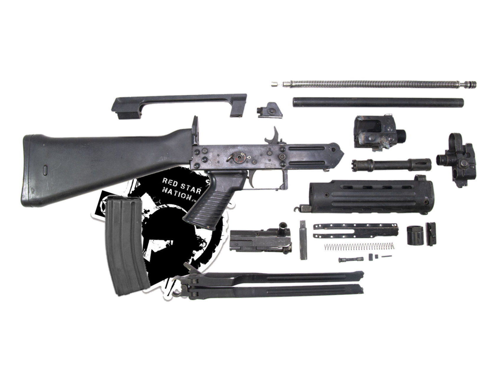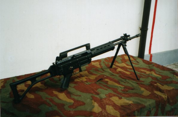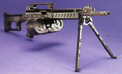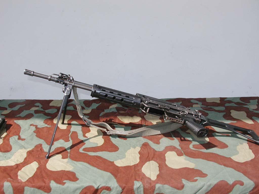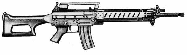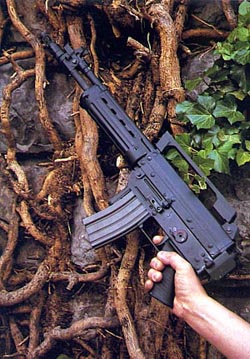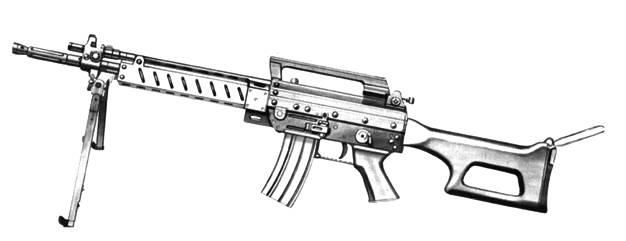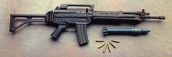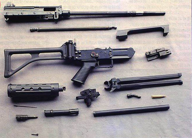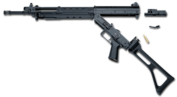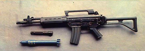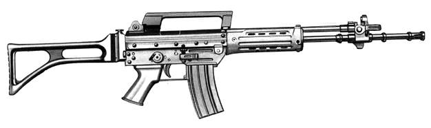 1 - 枪榴弹发射瞄准具 2 - 准星 3 - 导气孔调节装置 4 - 提把 5 - 机匣 6 - 照门 7 - 塑料枪托 8 - 折叠式枪托 9 - 手枪形握把 10 - 保险/快慢机柄 11 - 可打开的扳机护圈 12 - 弹匣 13 - 弹匣解脱扣 14 - 枪管 15 - 两脚架 16 - 枪管和消焰器可直接发射枪榴弹 |