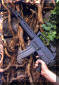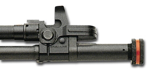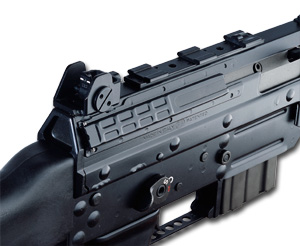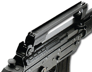 中空的提把,顶部有3点式瞄准具,照门和准星的尺寸都较大,适合近战中快速瞄准