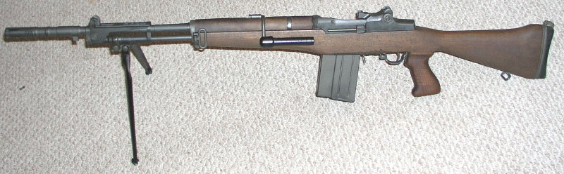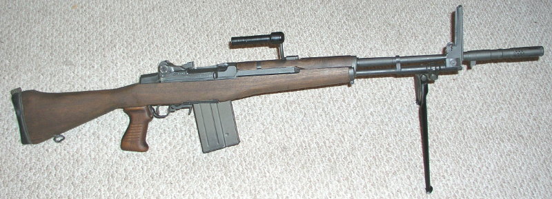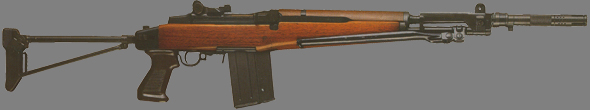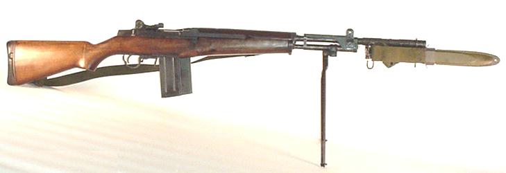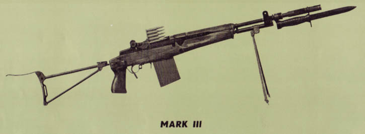 BM59 Mark Ⅳ,让比较沈重的枪管和塑料枪托,有铰接托底及小握把,但没有前握把,是用作班用轻机枪。