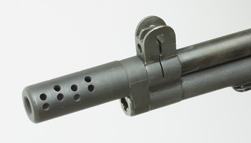 长的枪口装置除具有消焰和防跳功能外,还可用于发射枪榴弹,准星座前竖起的是枪榴弹瞄准具