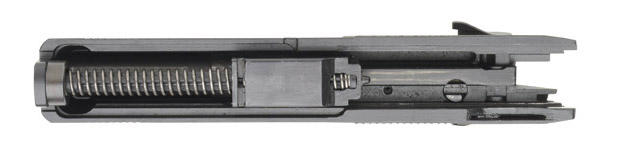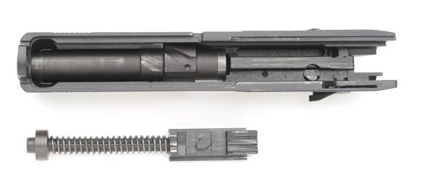 在套筒内闭锁位置的枪管及复进簧/导杆组件